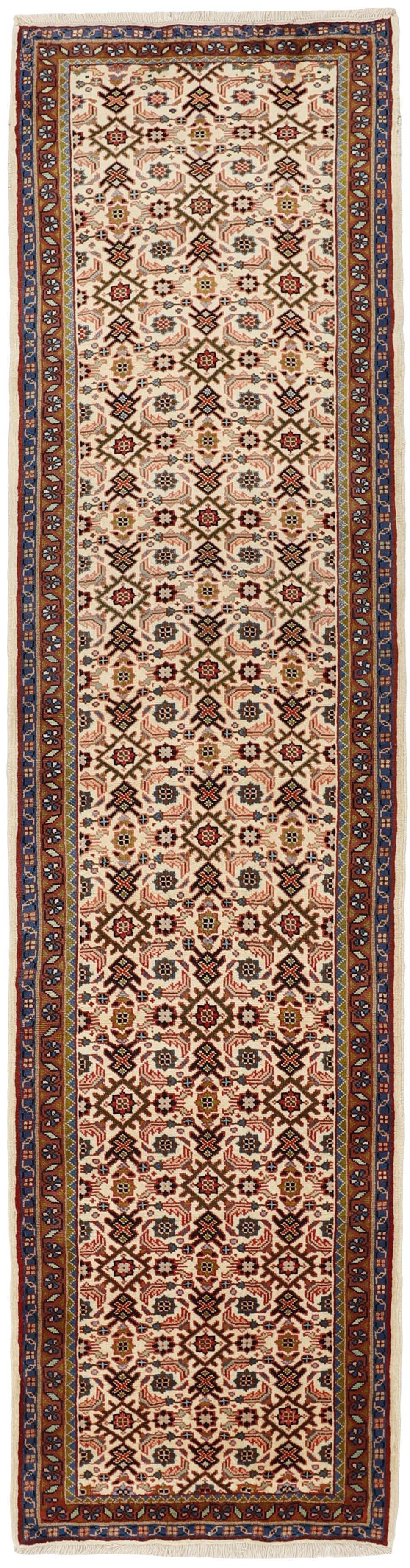 ArdebilItem no.: 1514451 Size: 80 cm x 300 cmArdebil and Meshkin (or Meshkinshahr) are situated in East Azerbaijan, east of Tabriz. Ardebil is the biggest and most important of the two cities, and it was home to the Safavaids, a royal family in 17th century Iran. The Safavid mosque and mausoleum complex is located in the city centre. The two 1542 rugs known as the Ardebil rugs, now shared between London and California, were originally placed in the mosque. The rugs produced in Ardebil and Meshkin today are heavily influenced by impressions from other parts of Azerbaijan; by the village rugs covered in geometrical patterns, and by the Tabriz rugs, with their simple patterns and medallions on a Herati base, which provides a beautiful contrast to the calm blue, red, or cream coloured base. Wool and cotton is used for the warp and weft, while the pile is generally wool, although there is a significant production of rugs with mixed silk/wool piles.