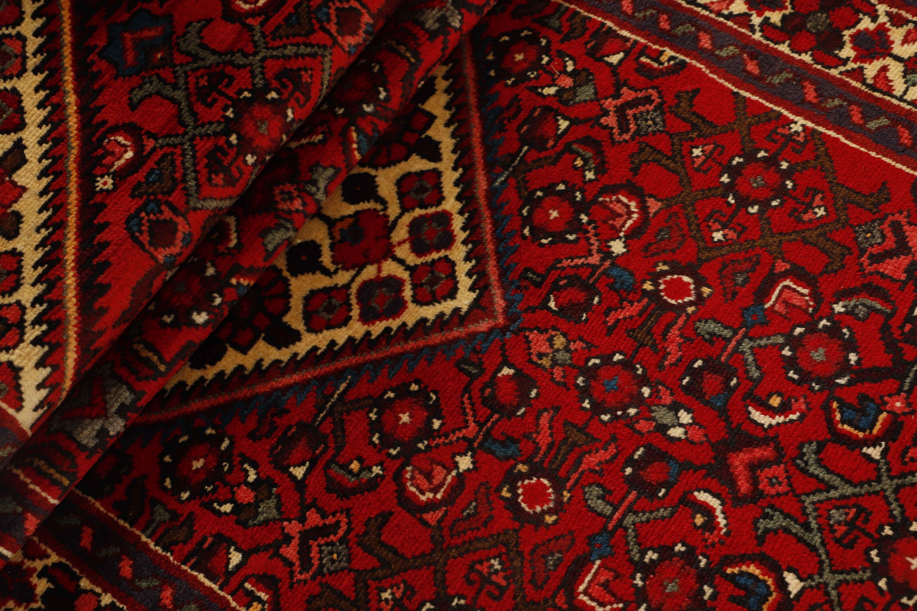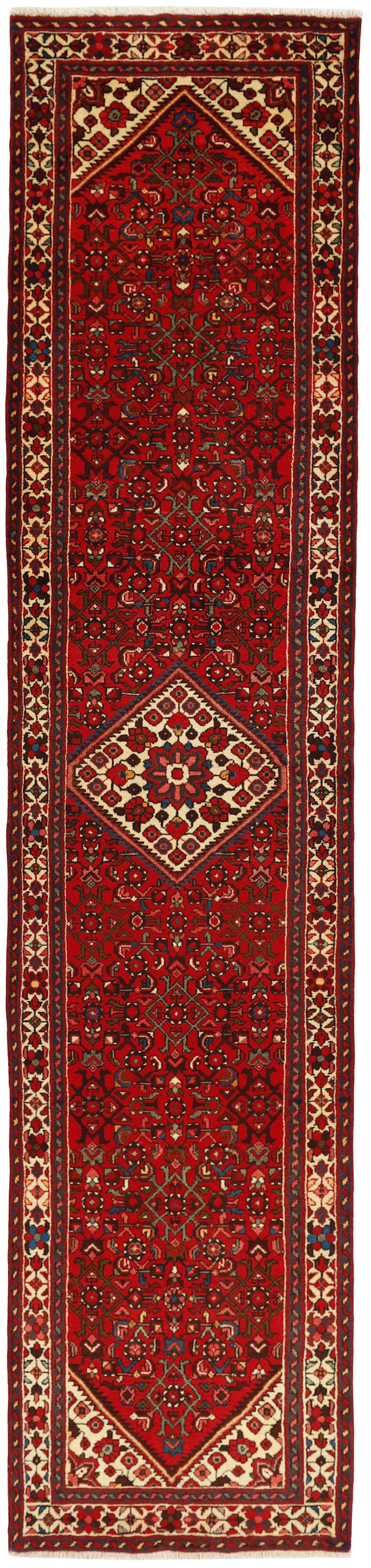 AsadabadItem no.: 1514455 Size: 84 cm x 380 cmThis rug is from the district of Hamadan which is an important centre for the rug trade, as well as the most productive rug production area of Iran. Hamadan is a major city with hundreds of thousands of people. Like Ekbatan, it was a main city of the Achemenian kings. It has an indigenous Jewish population and numerous monuments, of which the most important are the tombs of Esther and Mordicai (central to Jewish pilgrims), and the tomb at Avicenna. Hamadan is a provincial capitol. Two types of rugs are knotted. One is the so-called “city rug”, also known as the Shahrbaff. The production is modern and largely state controlled. The village production, however, is much more important; Hamadan is a market city for many rug producing villages that each has its own pattern. Most prominent are Borchalu, Tuserkman, Memraban, Khamseh, Begardeh, Enjilas, Hosseinabad, and Zandjan. There is a wide range of patterns but the quality is very consistent. The colours are strong, and often plant colours. The patterns are daring, although random, and Hosseinabad and Enjilas in particular are known for through going patterns. The rugs are usually not much bigger than 3 by 2 metres.