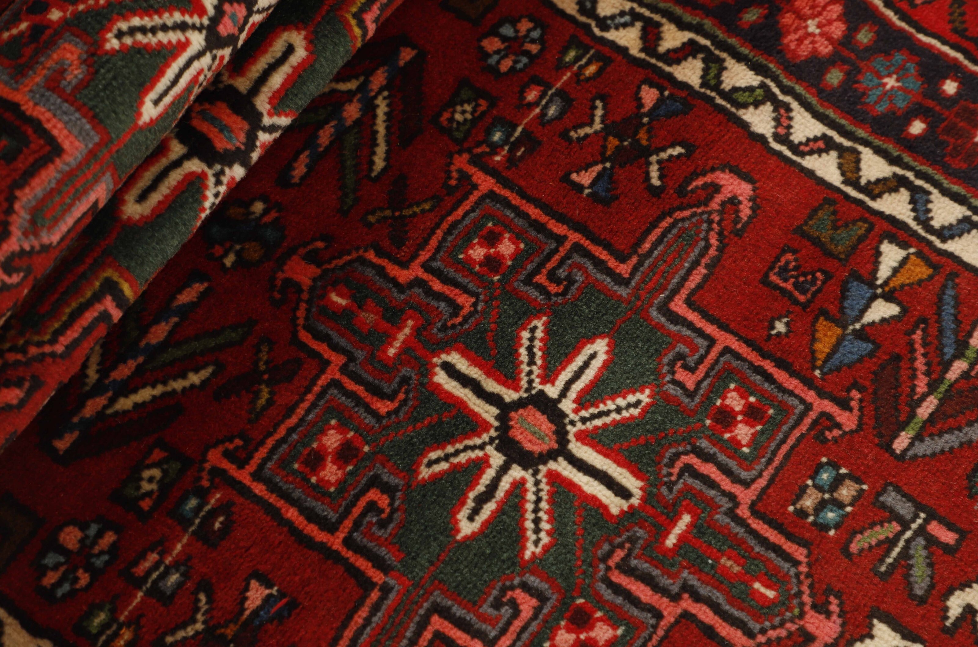 Gharadjeh, which means “The Black Mountain”, is an area in north-eastern Iran. The wool used for these rugs is of a very high quality, compared to the Tabriz wool that is otherwise used, and the resulting product is therefore very consistent. The Gharadjeh rugs are easily recognisable by their design, which consists of three medallions. The two outer ones are shaped like an eight sided star, while the central one is diamond shaped. The rugs are mostly found in earth tones, blue, and several nuances of green and yellow.