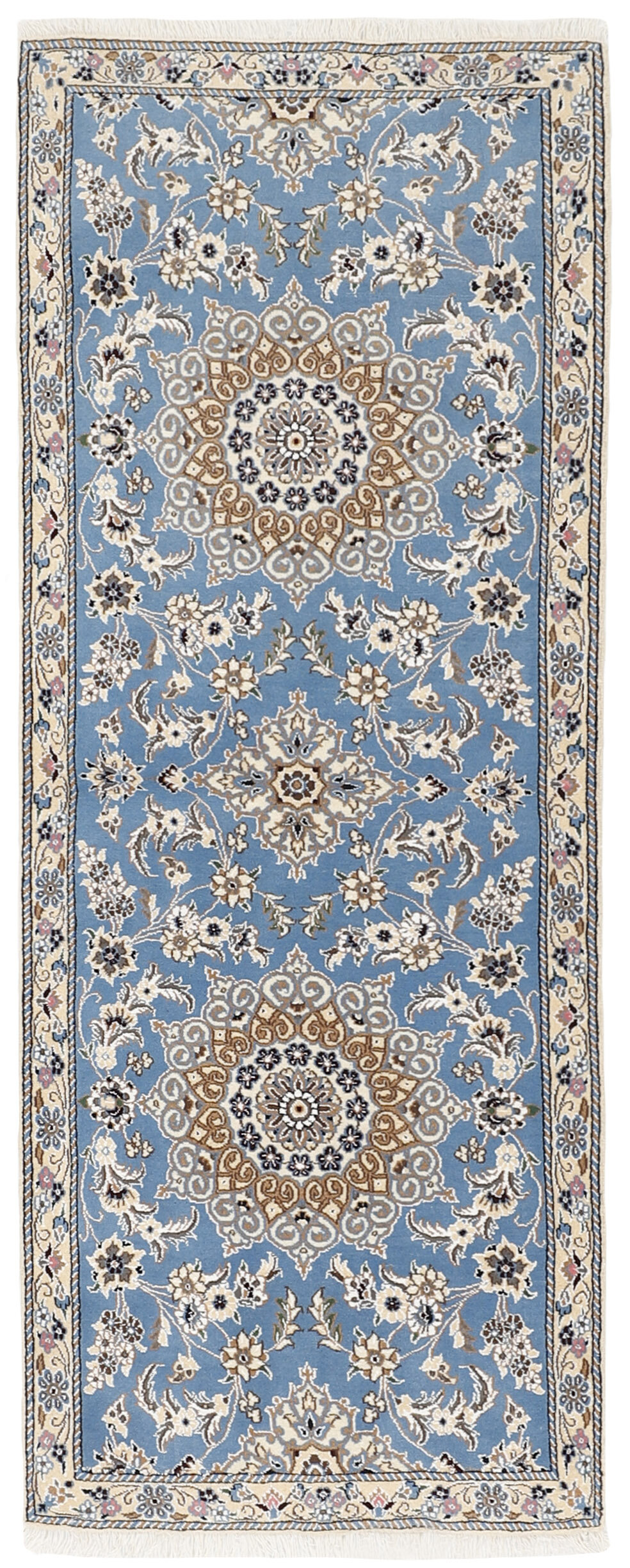 Nain 9 laItem no.: 1510718 Size: 80 cm x 207 cmNain is a city of about 50.000 people, located in the Isfahan Province. It has historic significance, since it was the last stop on caravan routes before Kavir-a-Lut, one of the deserts. The Nain Mosque is one of the oldest, and is built far better than the later and more famous mosques of Isfahan. The industry in Nain was traditionally focused on the production of wool garments, but the weavers switched to rug production when the demand fell. Their new products soon became famous, as the weavers were skilled and used good quality materials. The warp and weft are cotton, with a wool pile and contours of silk. Sometimes, silk is used more in the base. The colours are refined; nuances of ivory and cream, with small areas of red, green, and blue. As with the rugs from Isfahan, the patterns of the Nain rugs are also classical. The Nain rugs are made in all sizes, including the very large of up to 60m2, and some of these have a pure silk pile. The largest Nain rug produced was 20 by 20 metres.
