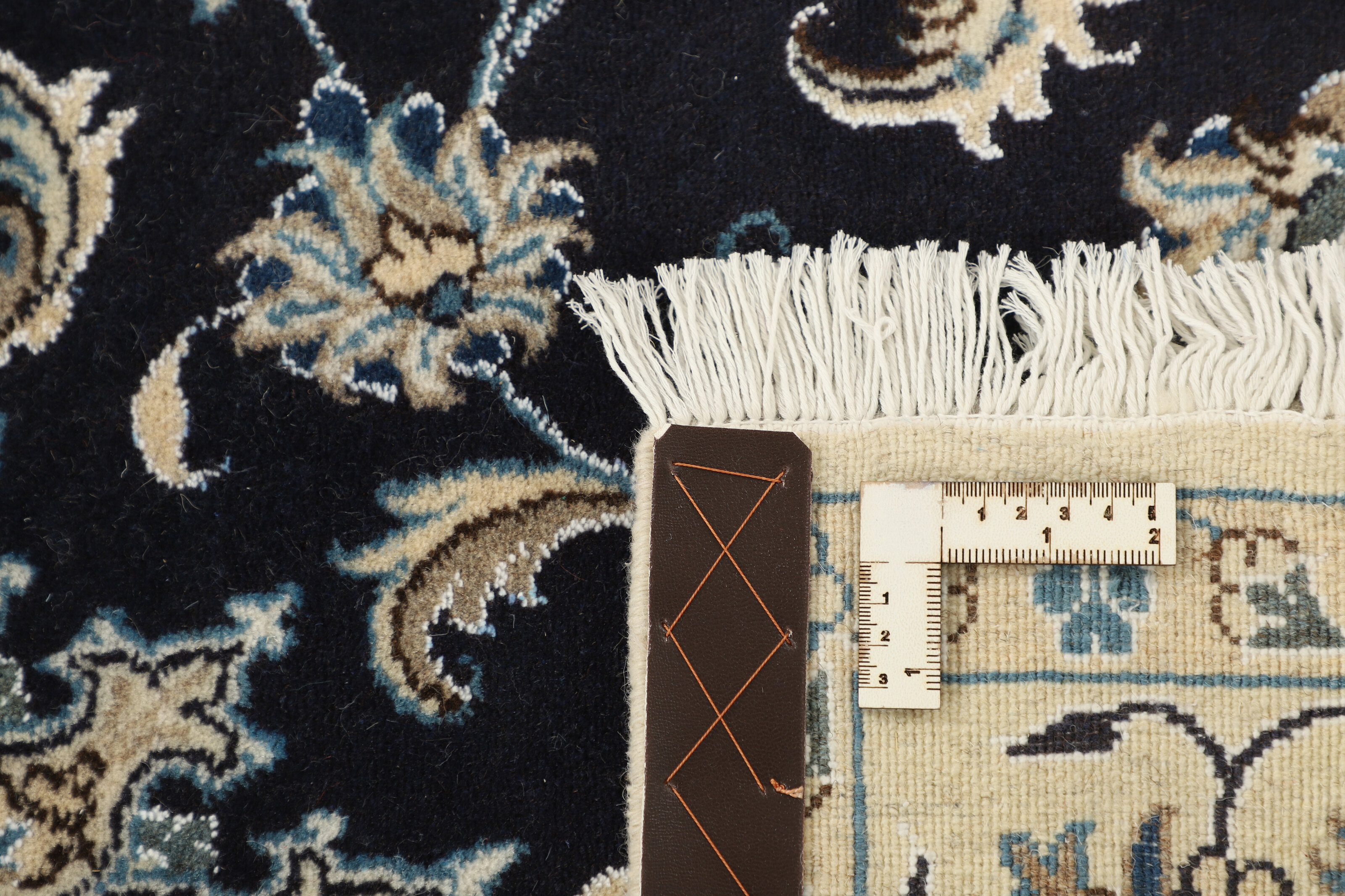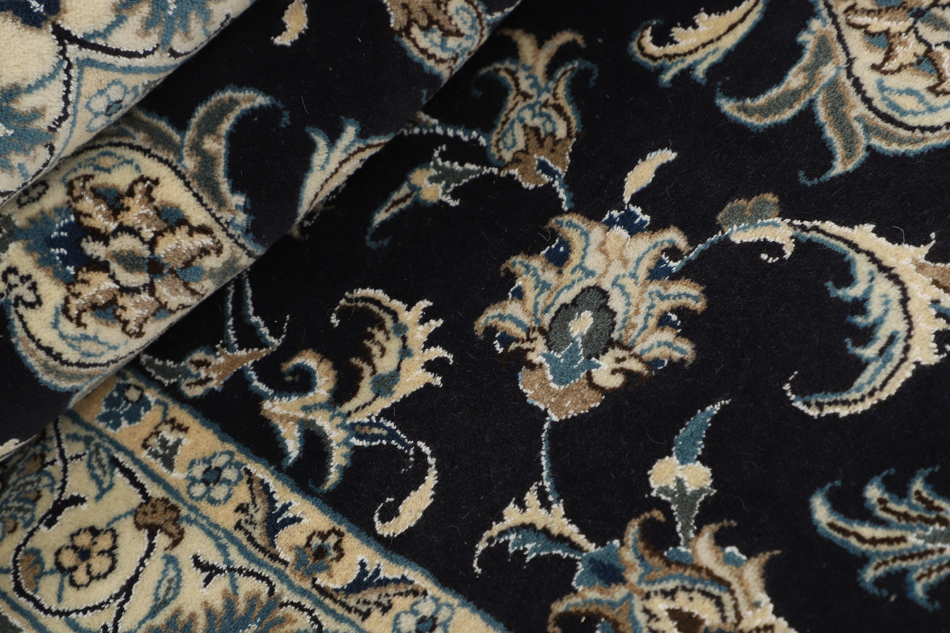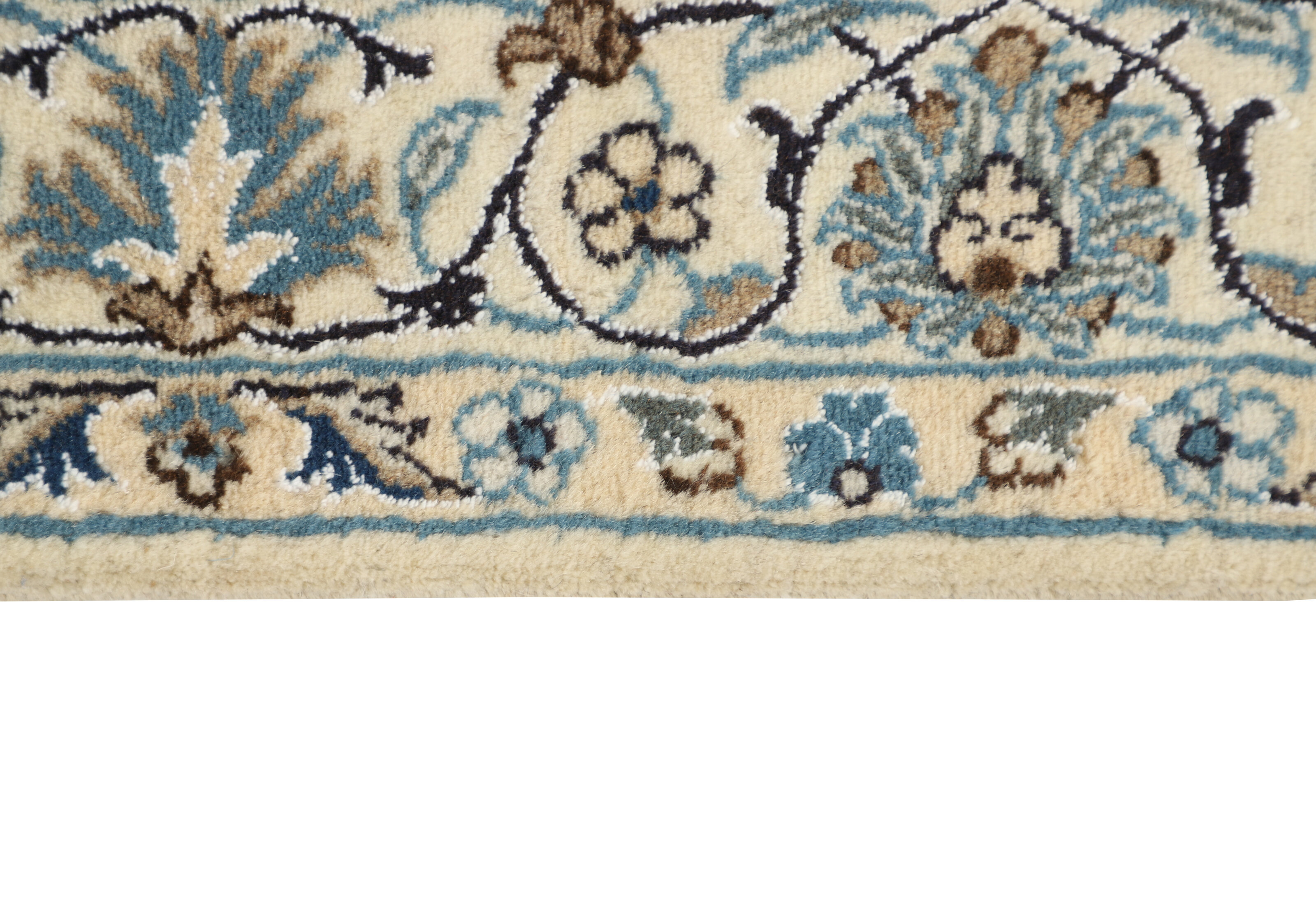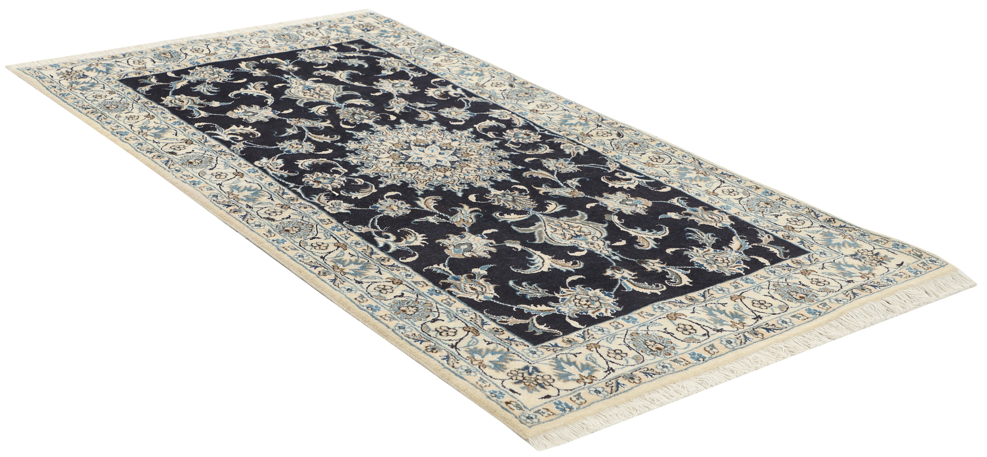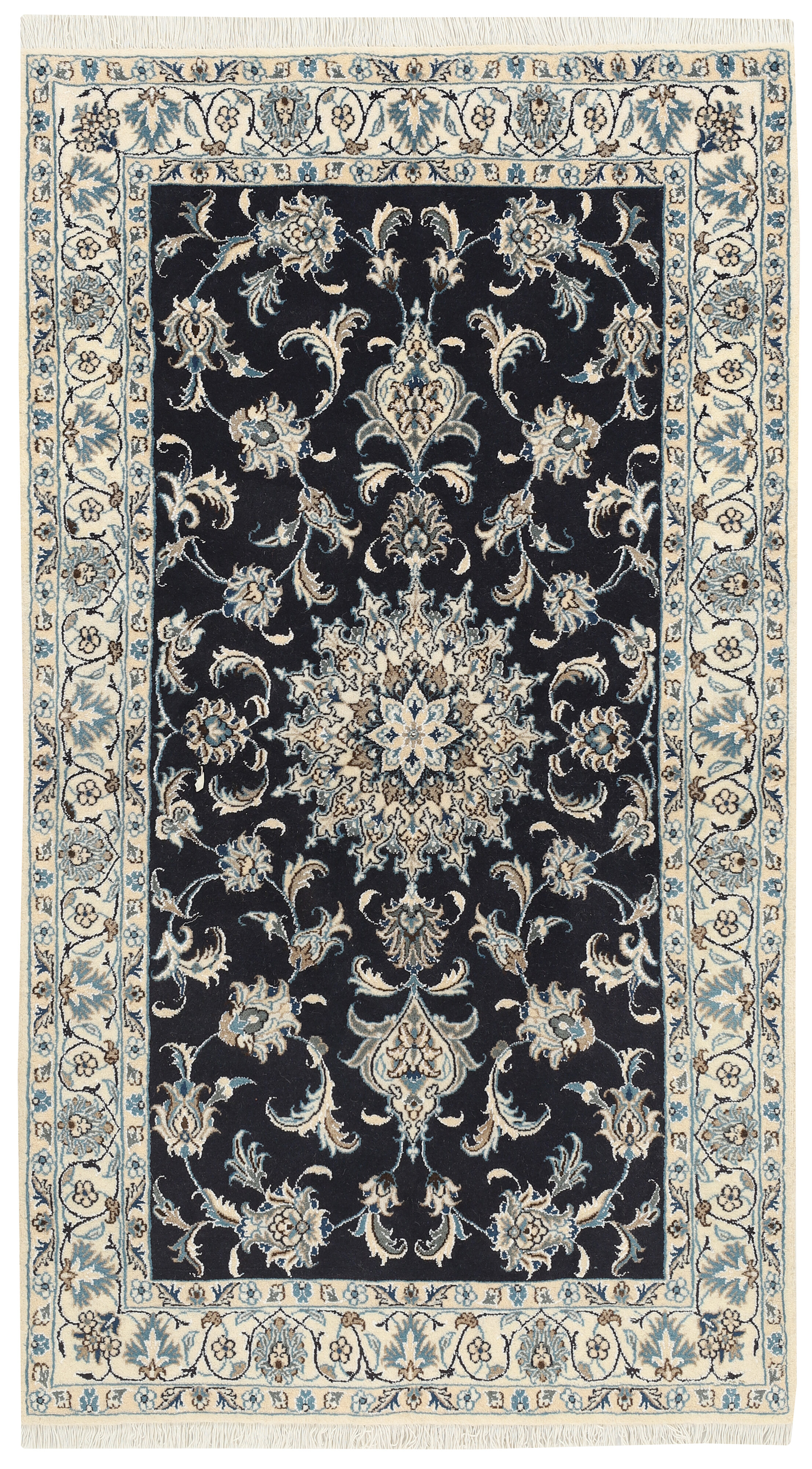 Nain KashmarItem no.: 1519802 Size: 117 cm x 205 cmNain is a city of about 50.000 people, located in the Isfahan Province. It has historic significance, since it was the last stop on caravan routes before Kavir-a-Lut, one of the deserts. The Nain Mosque is one of the oldest, and is built far better than the later and more famous mosques of Isfahan. The industry in Nain was traditionally focused on the production of wool garments, but the weavers switched to rug production when the demand fell. Their new products soon became famous, as the weavers were skilled and used good quality materials. The warp and weft are cotton, with a wool pile and contours of silk. Sometimes, silk is used more in the base. The colours are refined; nuances of ivory and cream, with small areas of red, green, and blue. As with the rugs from Isfahan, the patterns of the Nain rugs are also classical. The Nain rugs are made in all sizes, including the very large of up to 60m2, and some of these have a pure silk pile. The largest Nain rug produced was 20 by 20 metres.