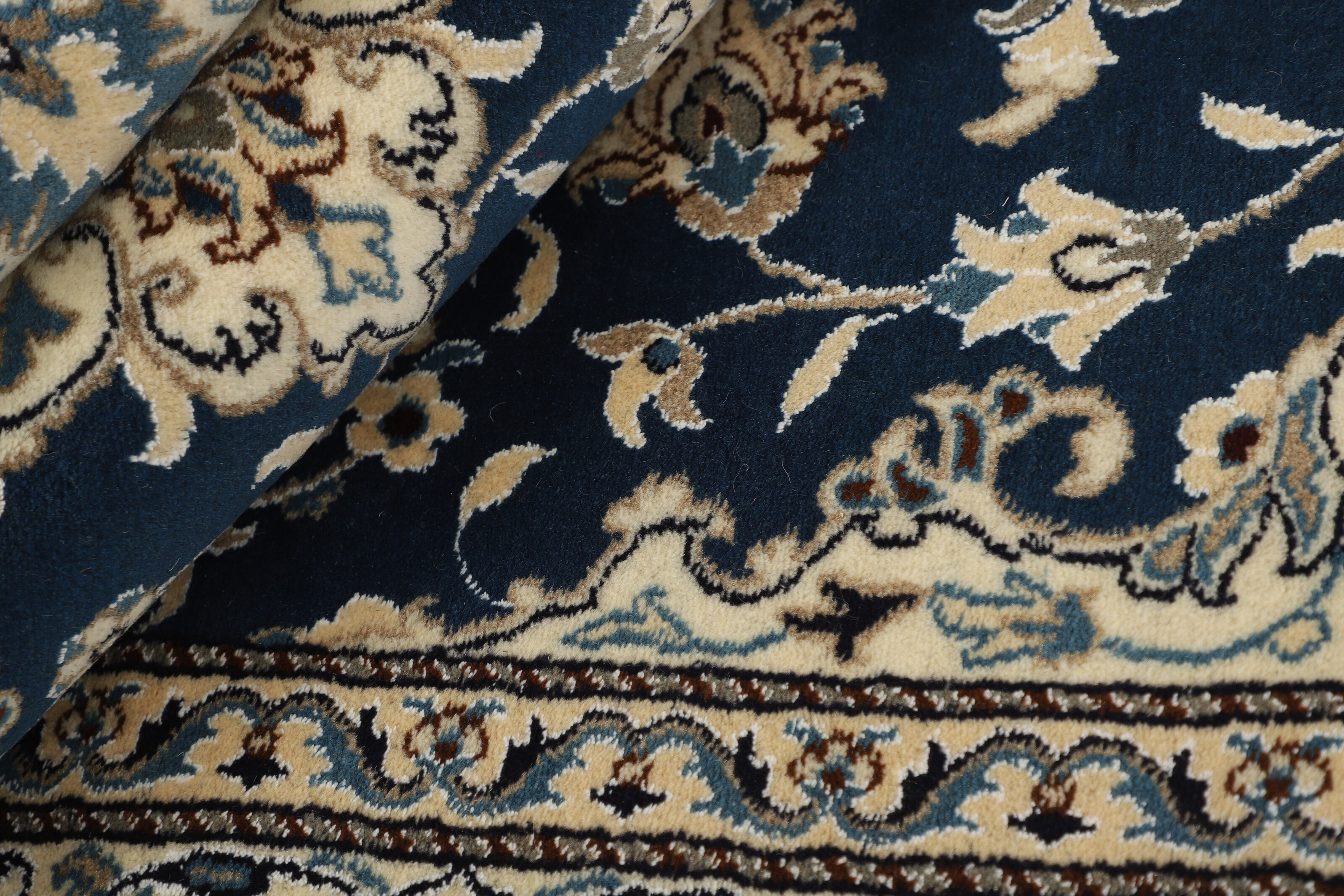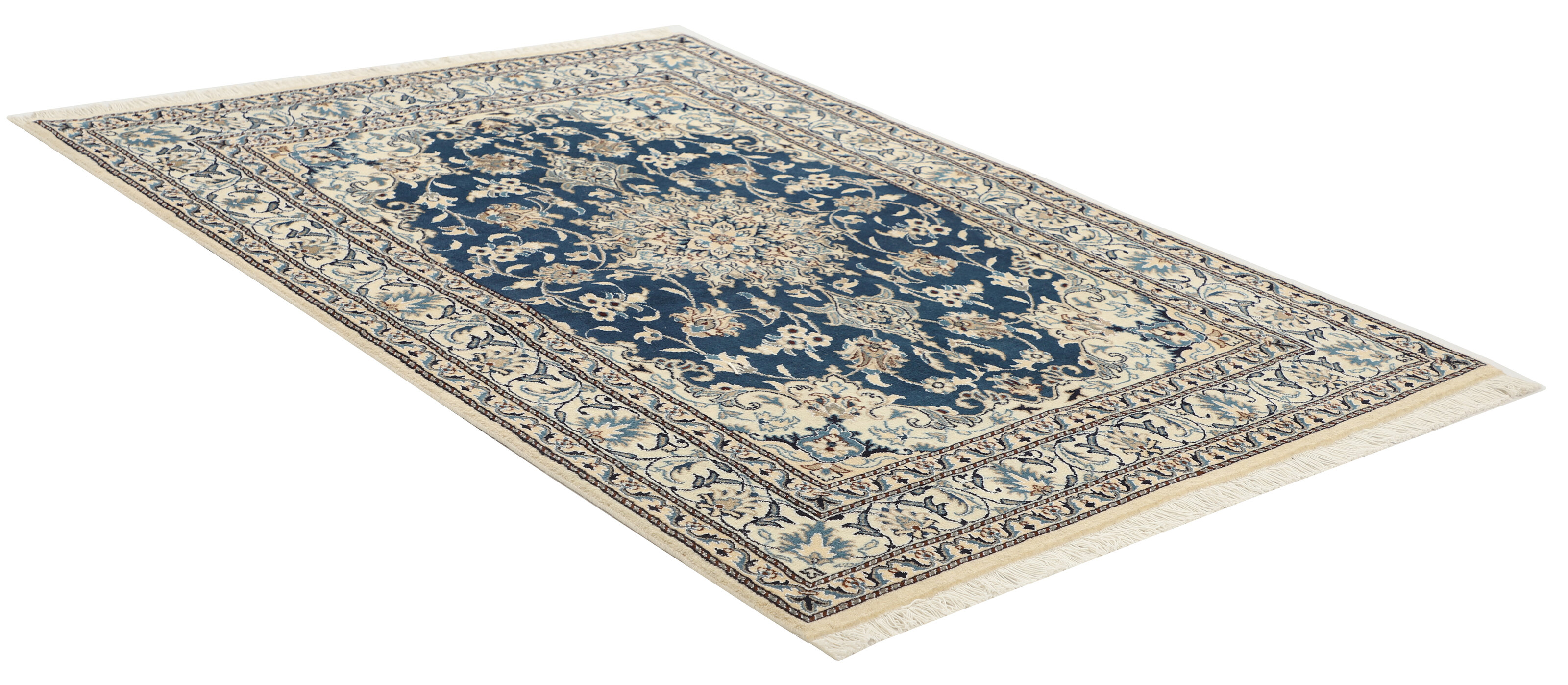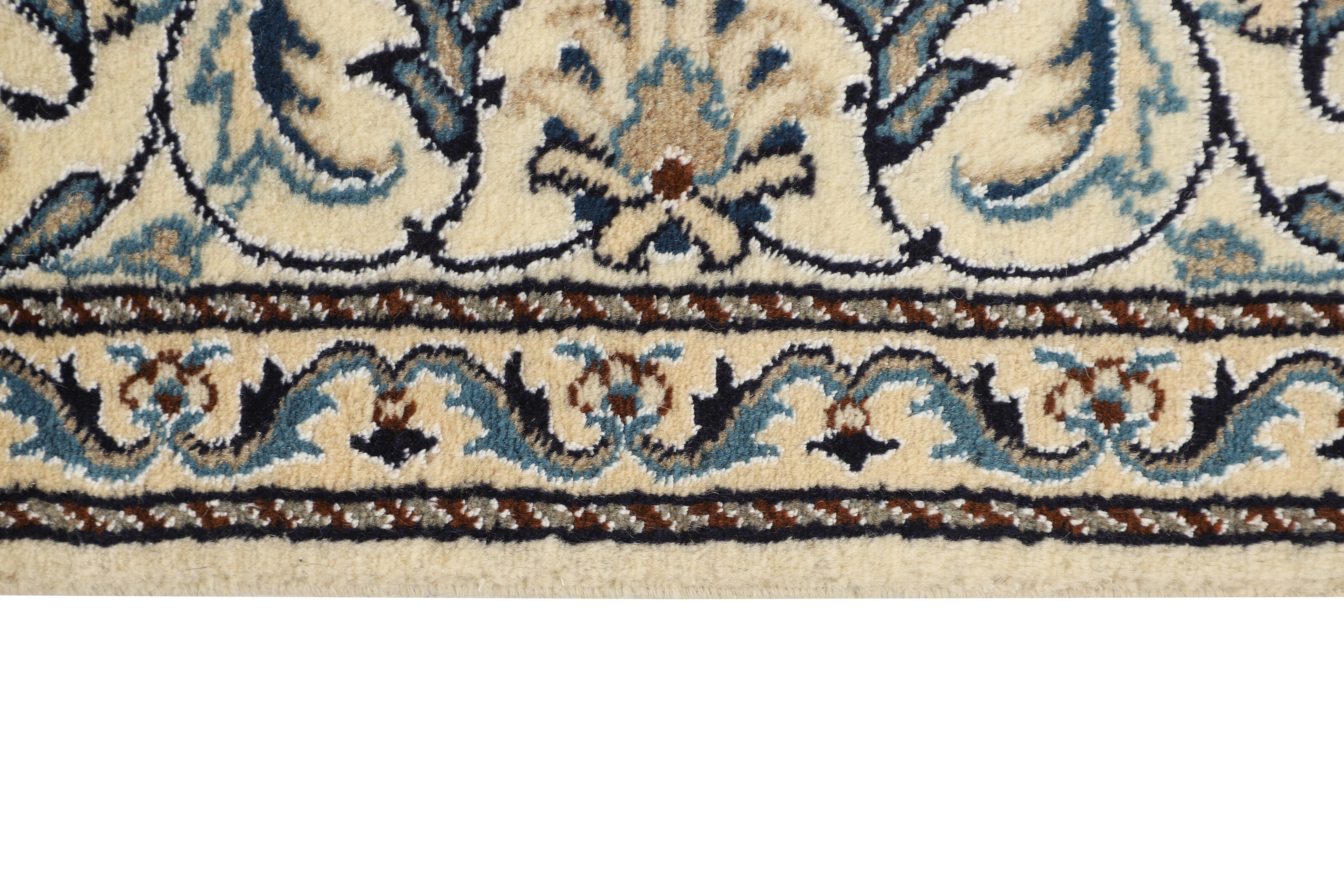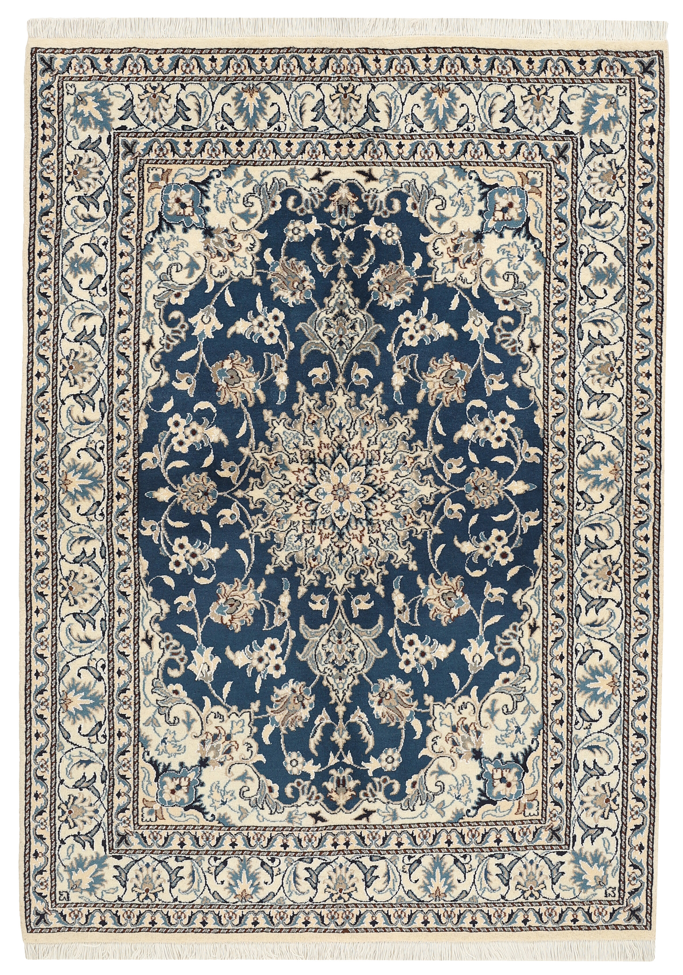 Nain KashmarItem no.: 1519818 Size: 147 cm x 205 cmNain is a city of about 50.000 people, located in the Isfahan Province. It has historic significance, since it was the last stop on caravan routes before Kavir-a-Lut, one of the deserts. The Nain Mosque is one of the oldest, and is built far better than the later and more famous mosques of Isfahan. The industry in Nain was traditionally focused on the production of wool garments, but the weavers switched to rug production when the demand fell. Their new products soon became famous, as the weavers were skilled and used good quality materials. The warp and weft are cotton, with a wool pile and contours of silk. Sometimes, silk is used more in the base. The colours are refined; nuances of ivory and cream, with small areas of red, green, and blue. As with the rugs from Isfahan, the patterns of the Nain rugs are also classical. The Nain rugs are made in all sizes, including the very large of up to 60m2, and some of these have a pure silk pile. The largest Nain rug produced was 20 by 20 metres.