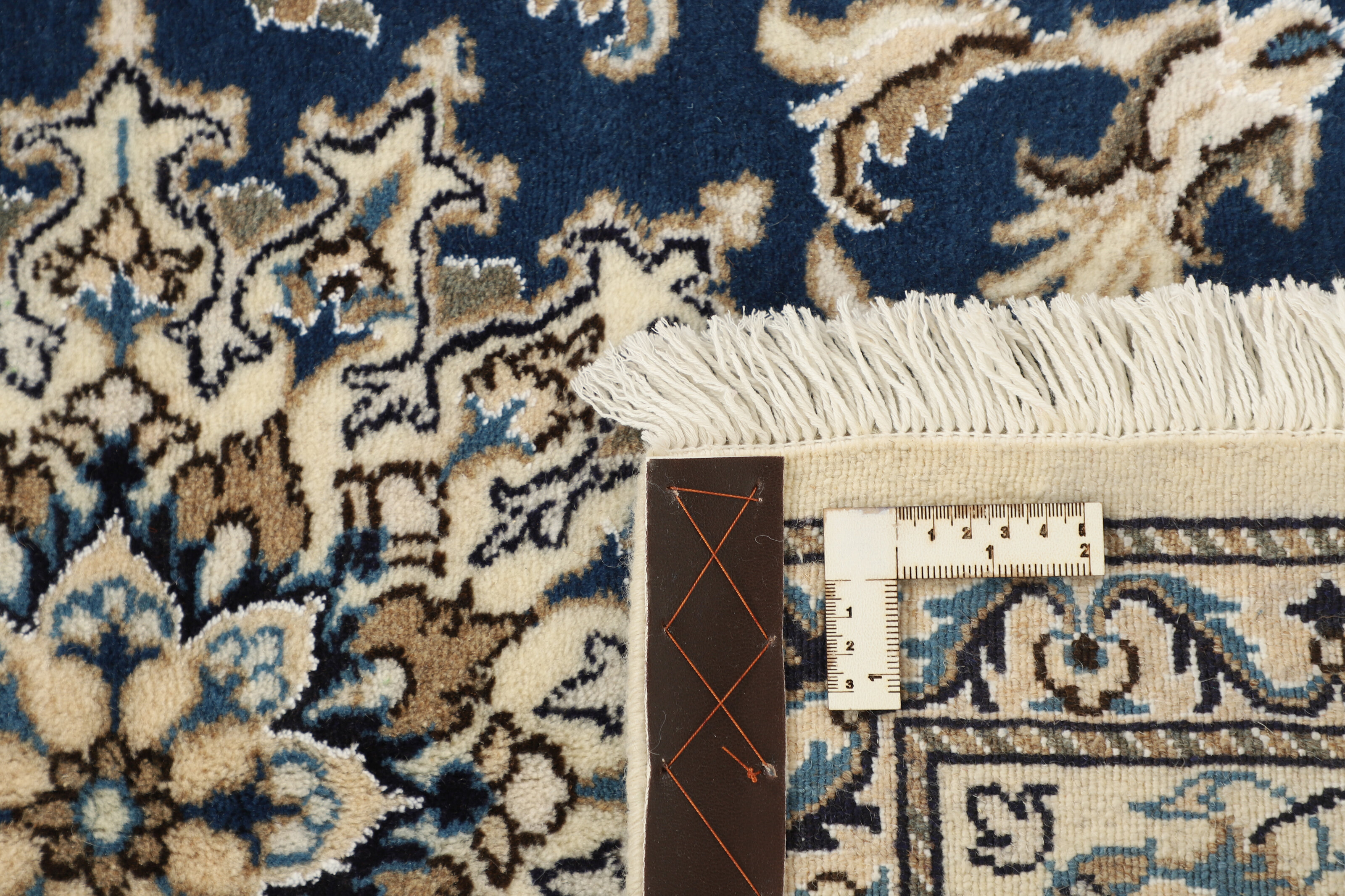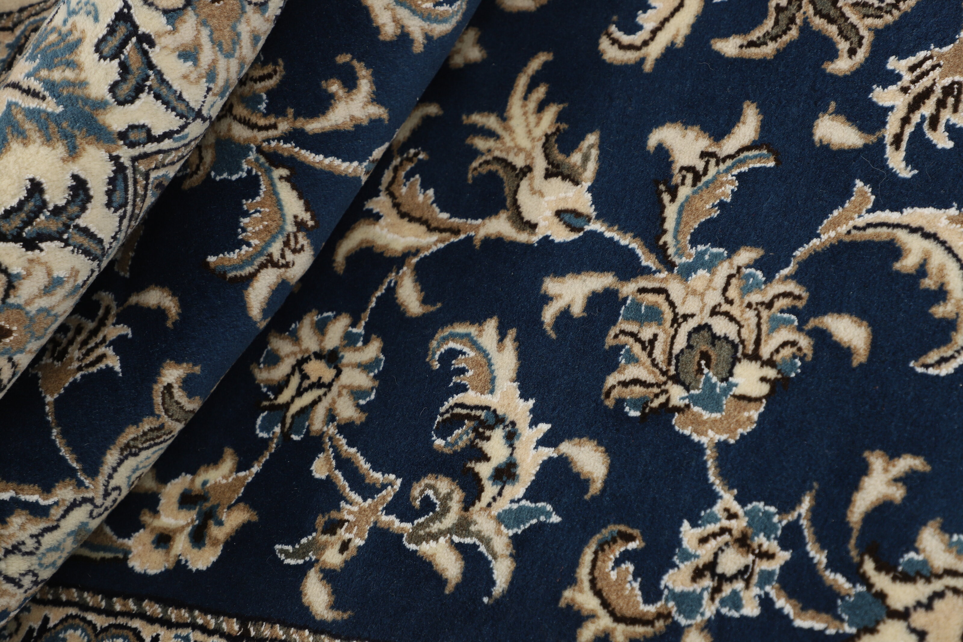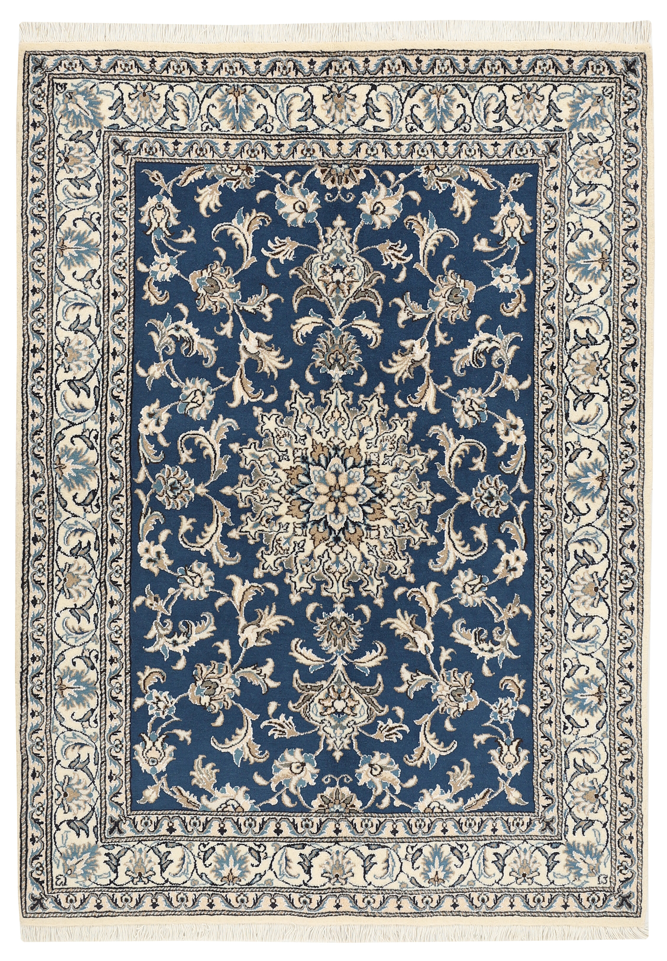 Nain KashmarItem no.: 1519820 Size: 142 cm x 195 cmNain is a city of about 50.000 people, located in the Isfahan Province. It has historic significance, since it was the last stop on caravan routes before Kavir-a-Lut, one of the deserts. The Nain Mosque is one of the oldest, and is built far better than the later and more famous mosques of Isfahan. The industry in Nain was traditionally focused on the production of wool garments, but the weavers switched to rug production when the demand fell. Their new products soon became famous, as the weavers were skilled and used good quality materials. The warp and weft are cotton, with a wool pile and contours of silk. Sometimes, silk is used more in the base. The colours are refined; nuances of ivory and cream, with small areas of red, green, and blue. As with the rugs from Isfahan, the patterns of the Nain rugs are also classical. The Nain rugs are made in all sizes, including the very large of up to 60m2, and some of these have a pure silk pile. The largest Nain rug produced was 20 by 20 metres.