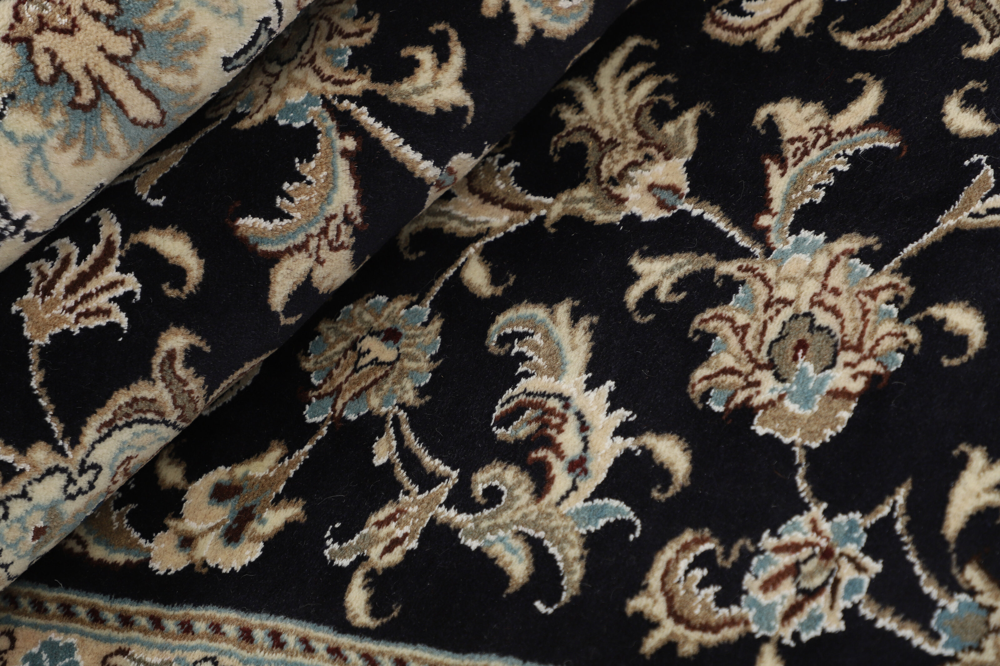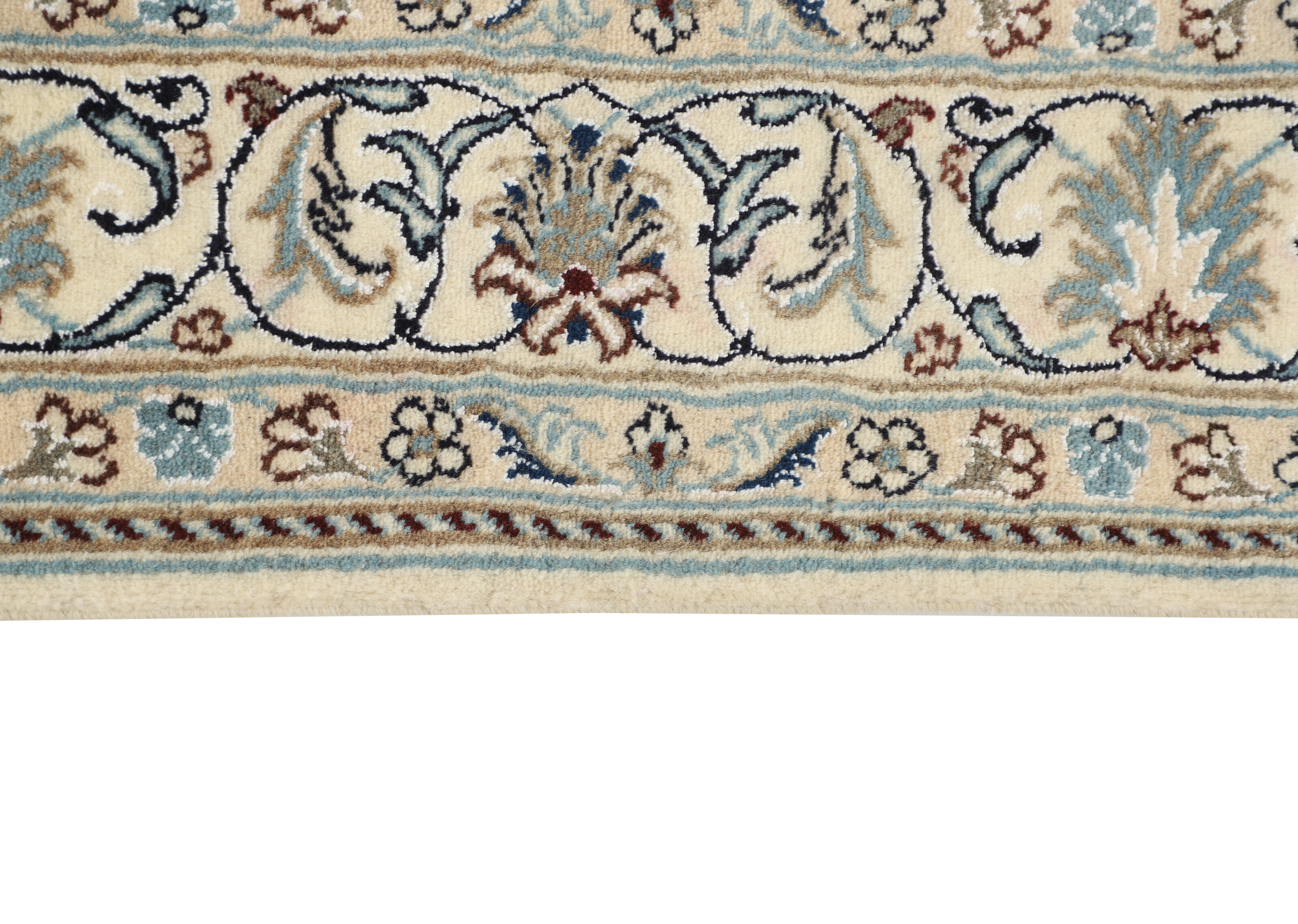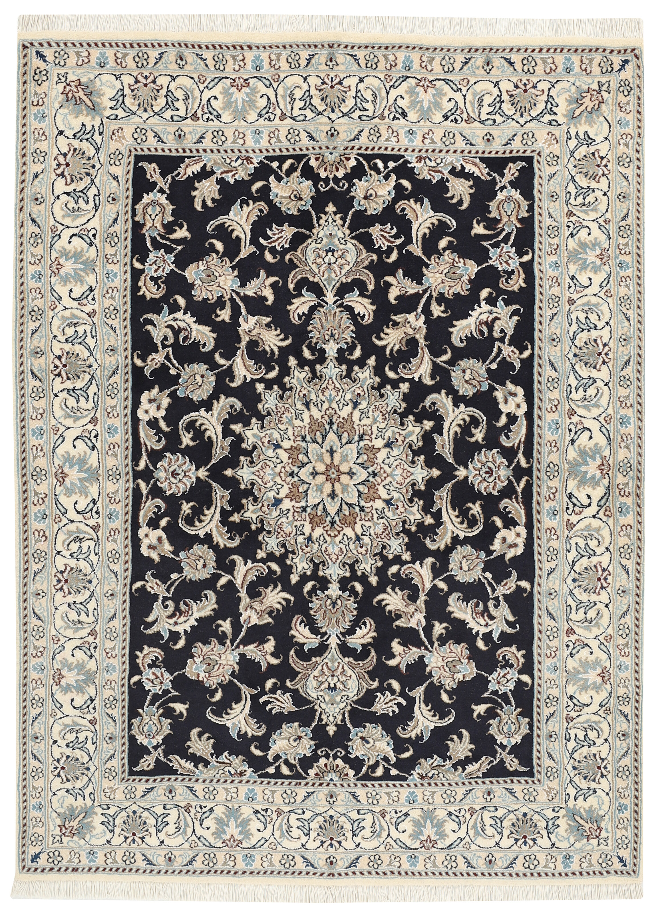 Nain KashmarItem no.: 1519821 Size: 145 cm x 193 cmNain is a city of about 50.000 people, located in the Isfahan Province. It has historic significance, since it was the last stop on caravan routes before Kavir-a-Lut, one of the deserts. The Nain Mosque is one of the oldest, and is built far better than the later and more famous mosques of Isfahan. The industry in Nain was traditionally focused on the production of wool garments, but the weavers switched to rug production when the demand fell. Their new products soon became famous, as the weavers were skilled and used good quality materials. The warp and weft are cotton, with a wool pile and contours of silk. Sometimes, silk is used more in the base. The colours are refined; nuances of ivory and cream, with small areas of red, green, and blue. As with the rugs from Isfahan, the patterns of the Nain rugs are also classical. The Nain rugs are made in all sizes, including the very large of up to 60m2, and some of these have a pure silk pile. The largest Nain rug produced was 20 by 20 metres.