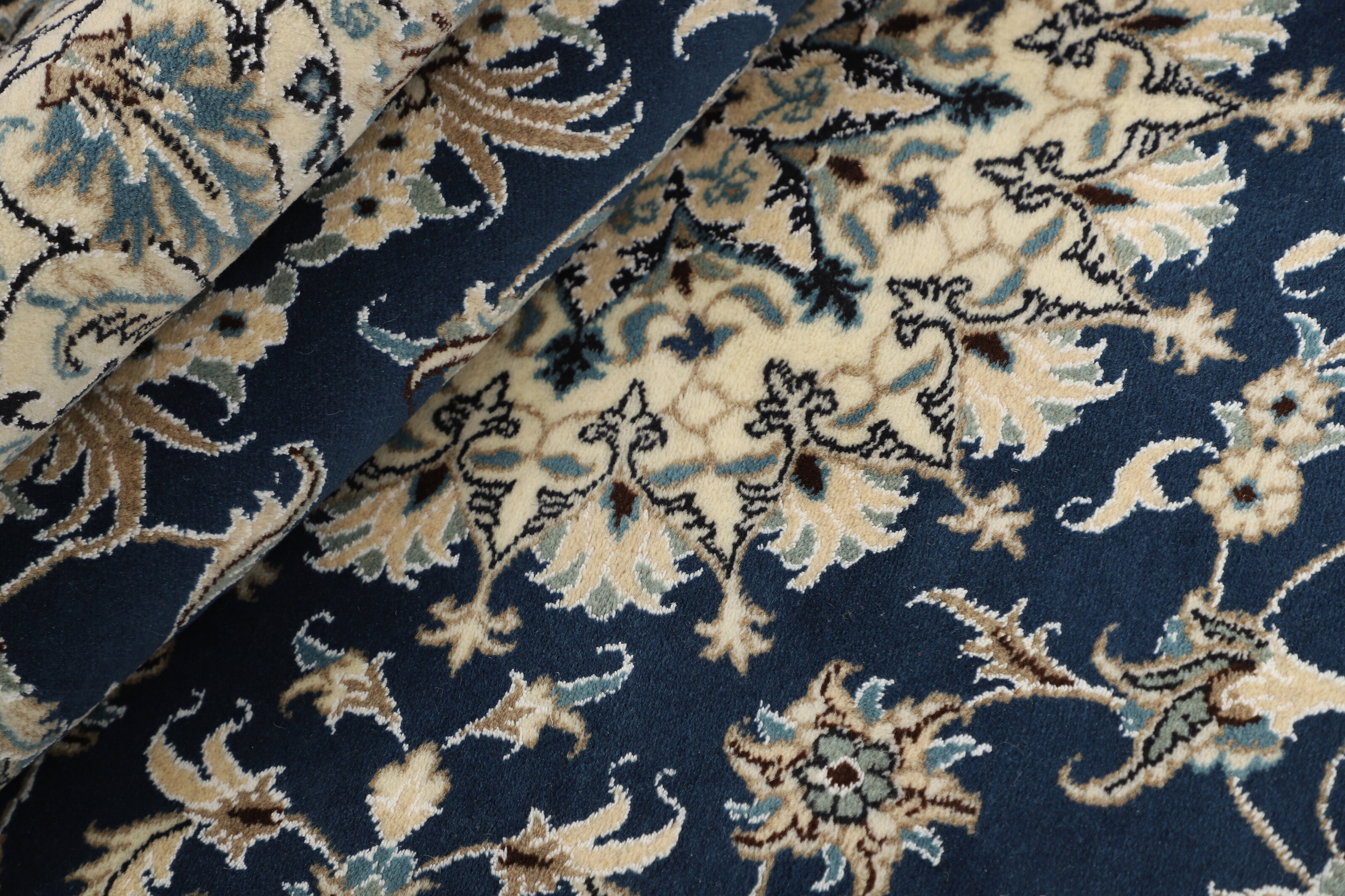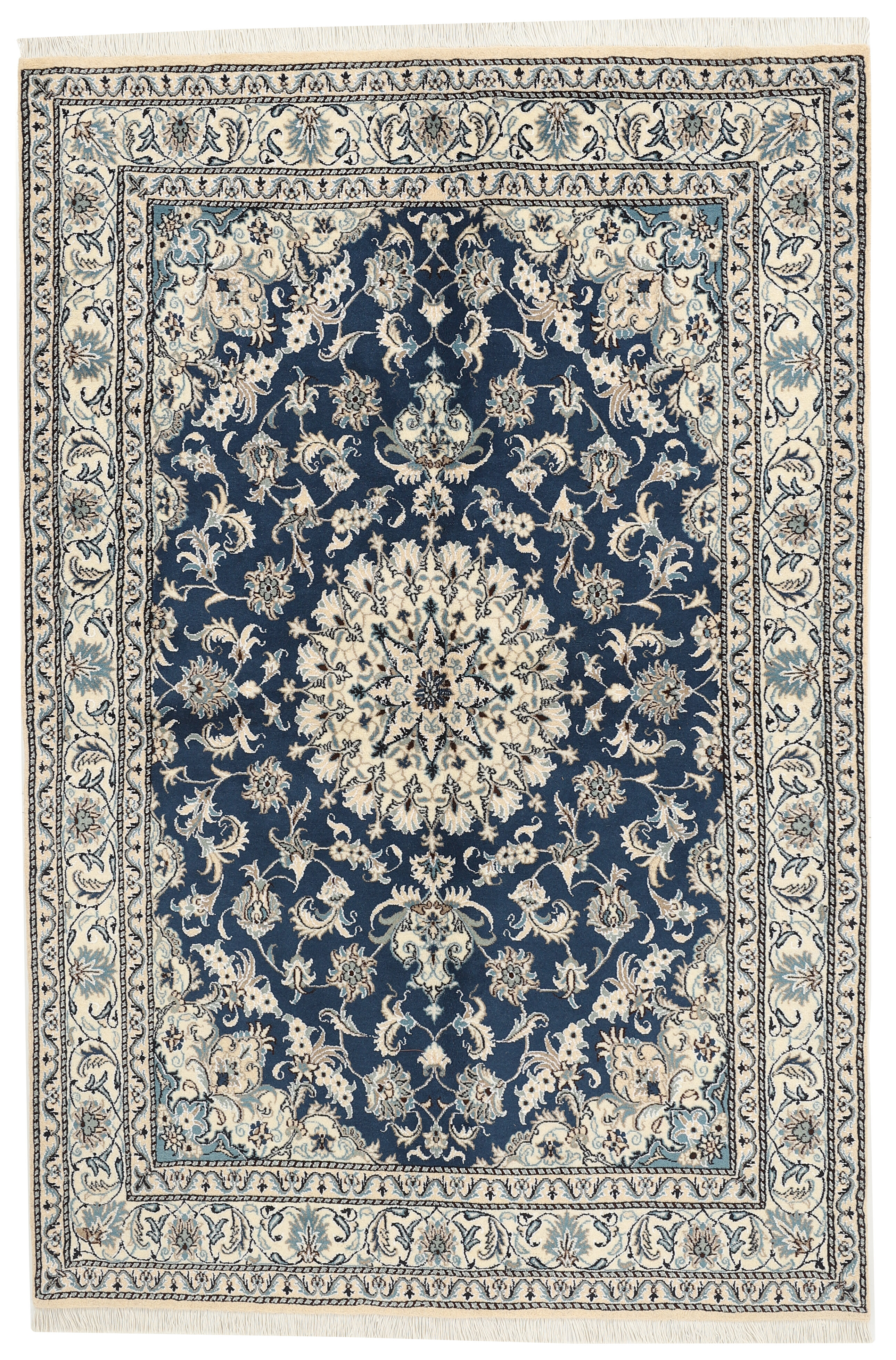 Nain KashmarItem no.: 1519823 Size: 160 cm x 240 cmNain is a city of about 50.000 people, located in the Isfahan Province. It has historic significance, since it was the last stop on caravan routes before Kavir-a-Lut, one of the deserts. The Nain Mosque is one of the oldest, and is built far better than the later and more famous mosques of Isfahan. The industry in Nain was traditionally focused on the production of wool garments, but the weavers switched to rug production when the demand fell. Their new products soon became famous, as the weavers were skilled and used good quality materials. The warp and weft are cotton, with a wool pile and contours of silk. Sometimes, silk is used more in the base. The colours are refined; nuances of ivory and cream, with small areas of red, green, and blue. As with the rugs from Isfahan, the patterns of the Nain rugs are also classical. The Nain rugs are made in all sizes, including the very large of up to 60m2, and some of these have a pure silk pile. The largest Nain rug produced was 20 by 20 metres.