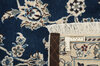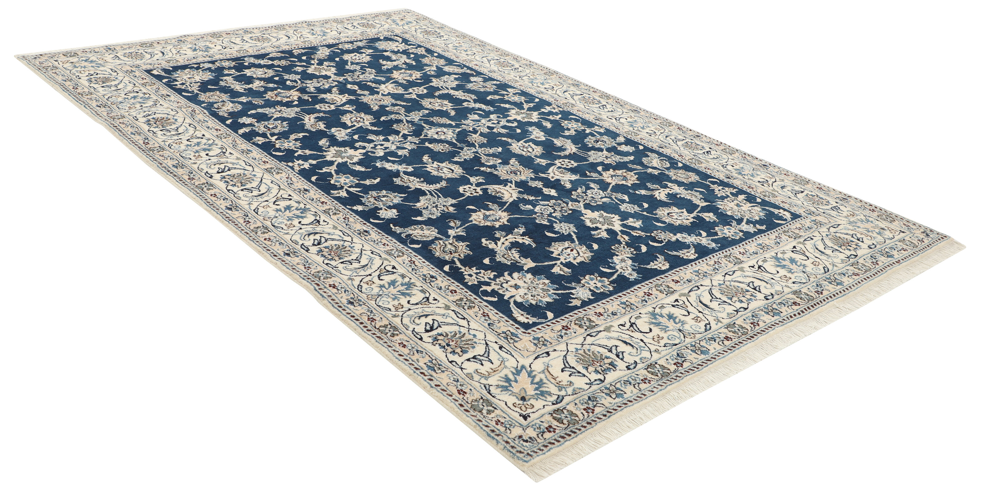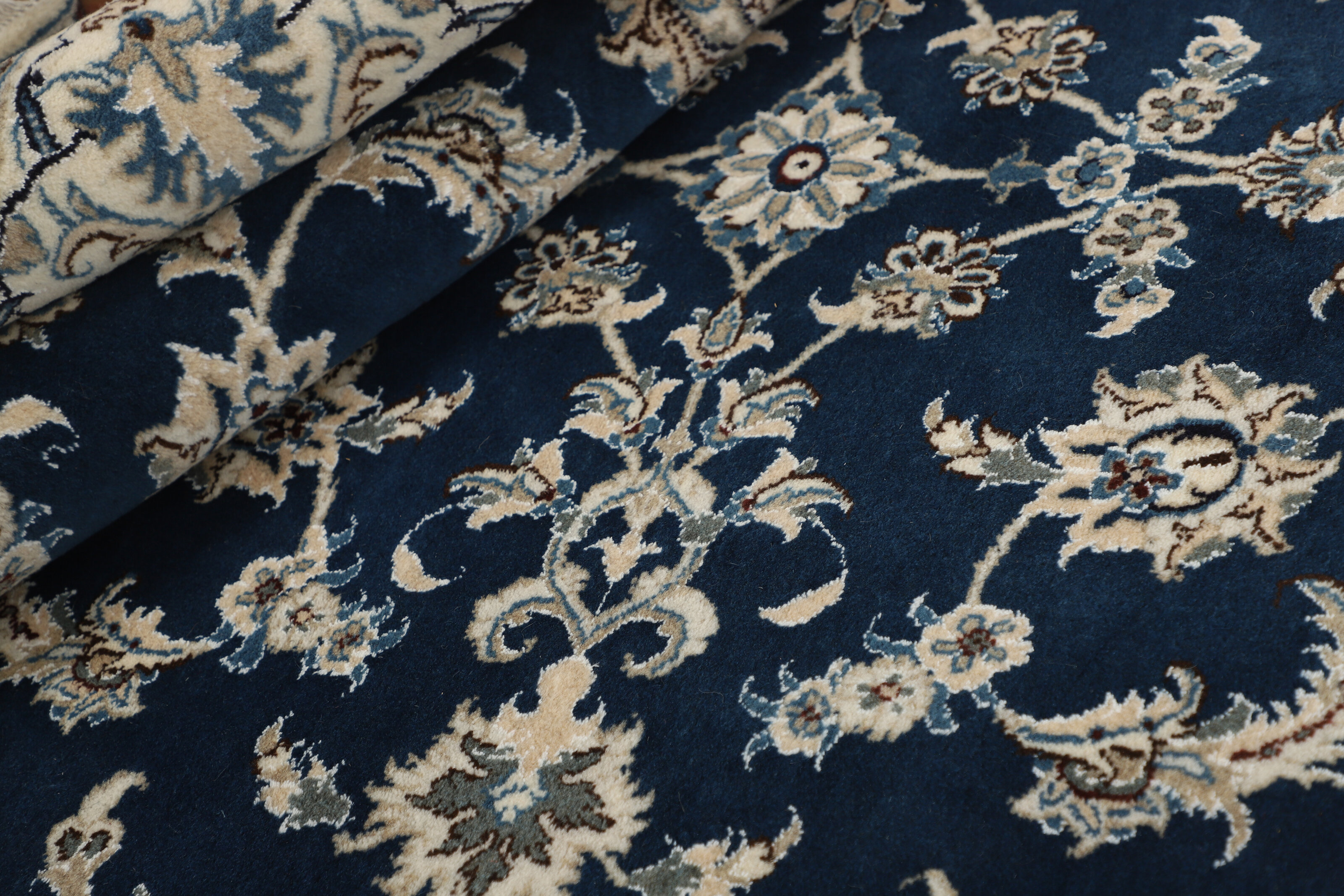 Nain KashmarItem no.: 1519829 Size: 195 cm x 295 cmNain is a city of about 50.000 people, located in the Isfahan Province. It has historic significance, since it was the last stop on caravan routes before Kavir-a-Lut, one of the deserts. The Nain Mosque is one of the oldest, and is built far better than the later and more famous mosques of Isfahan. The industry in Nain was traditionally focused on the production of wool garments, but the weavers switched to rug production when the demand fell. Their new products soon became famous, as the weavers were skilled and used good quality materials. The warp and weft are cotton, with a wool pile and contours of silk. Sometimes, silk is used more in the base. The colours are refined; nuances of ivory and cream, with small areas of red, green, and blue. As with the rugs from Isfahan, the patterns of the Nain rugs are also classical. The Nain rugs are made in all sizes, including the very large of up to 60m2, and some of these have a pure silk pile. The largest Nain rug produced was 20 by 20 metres.