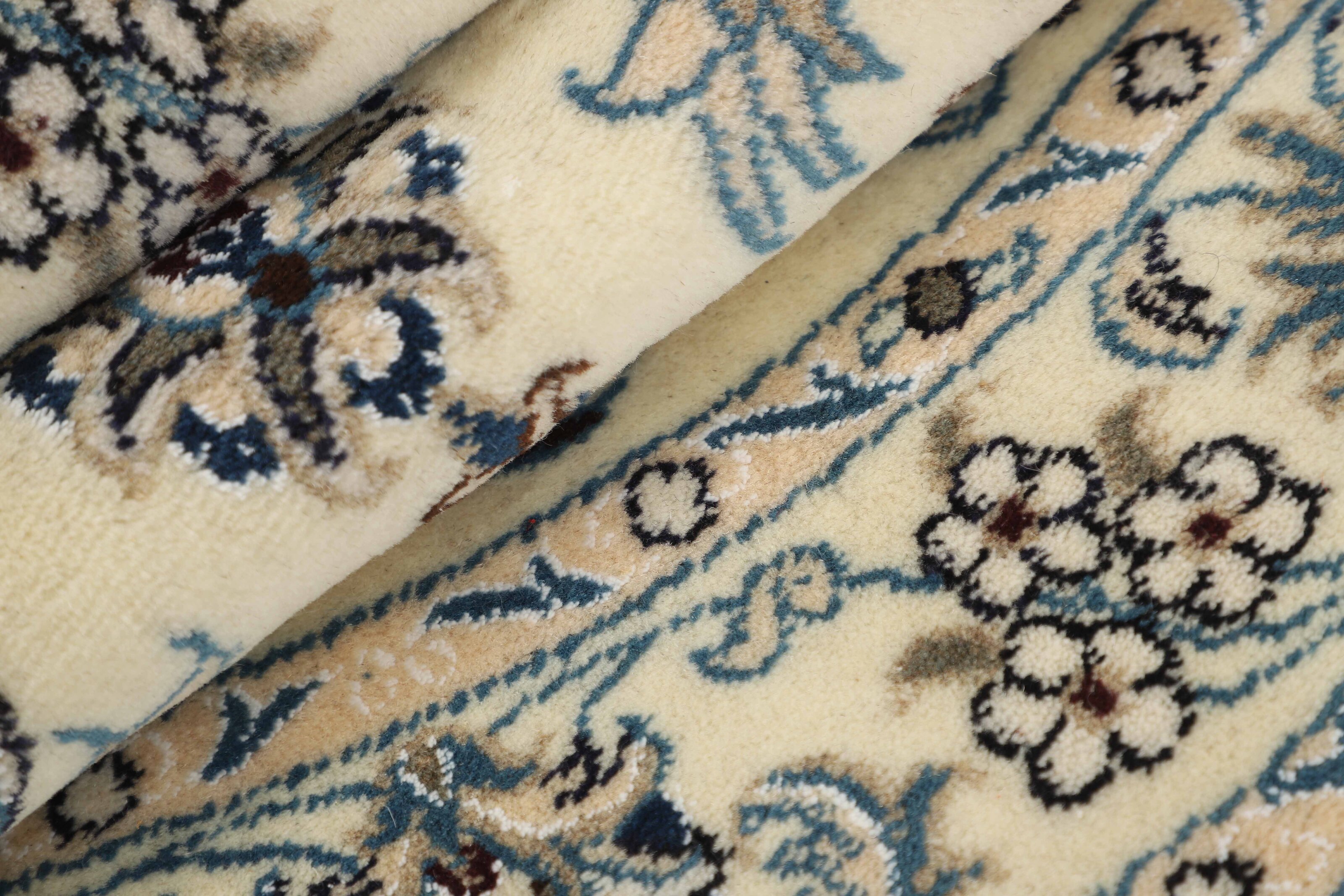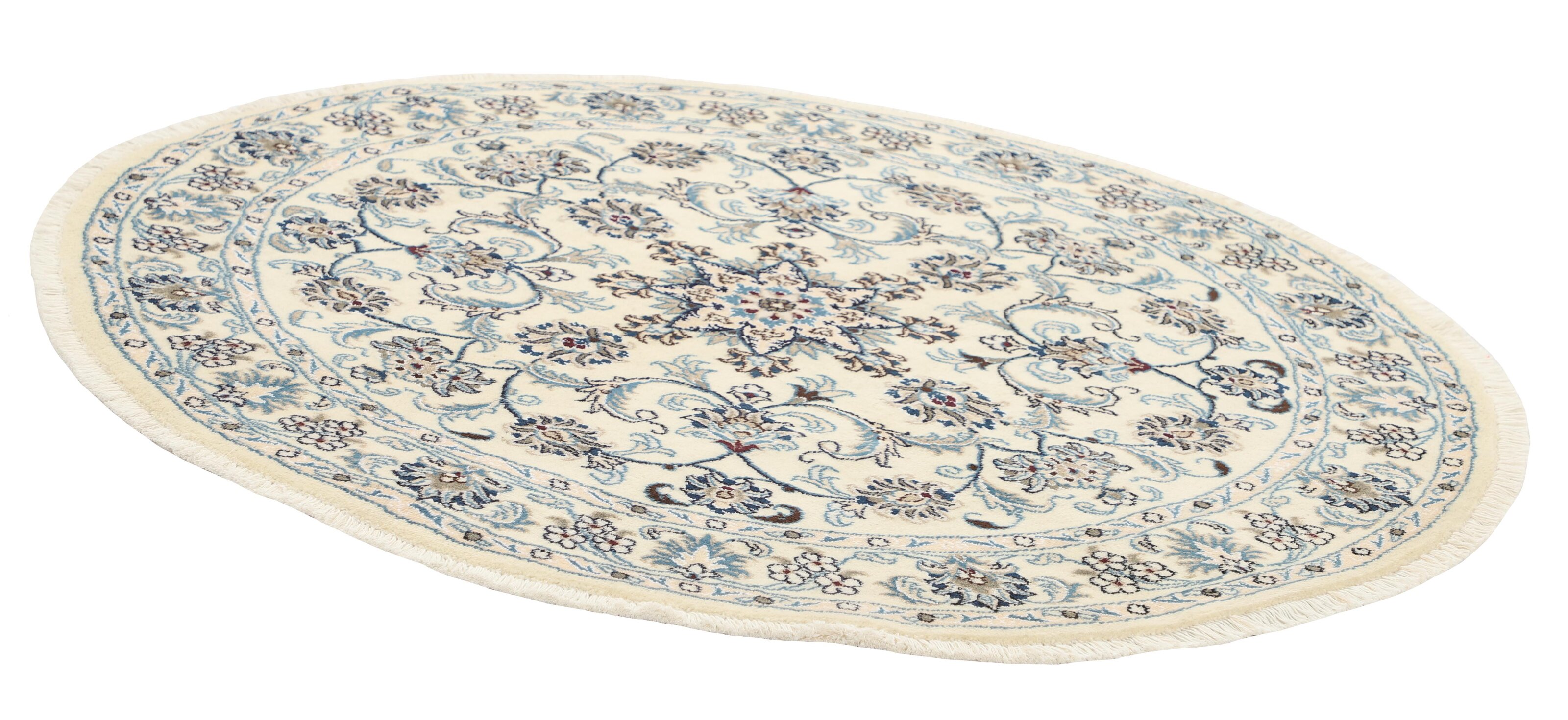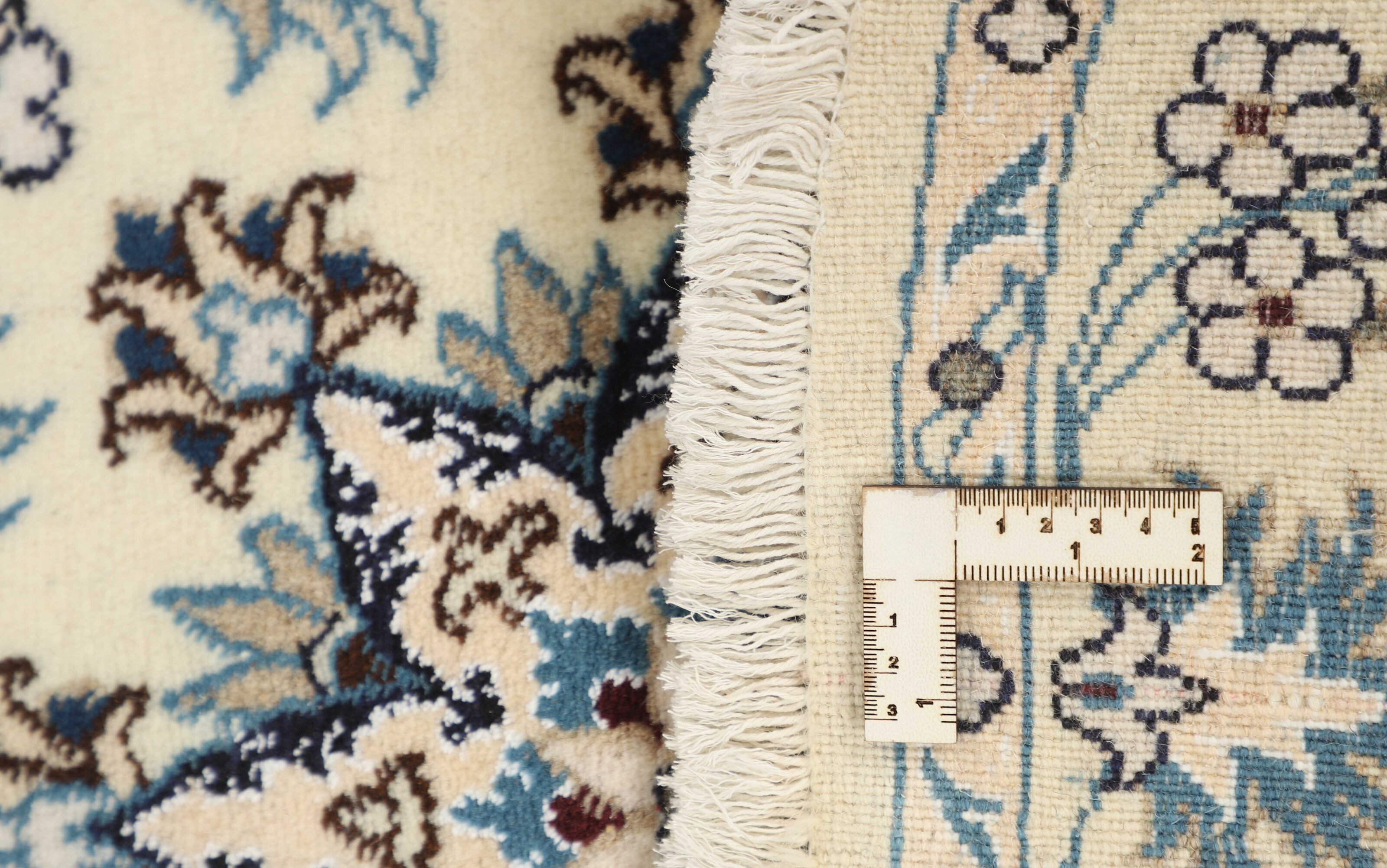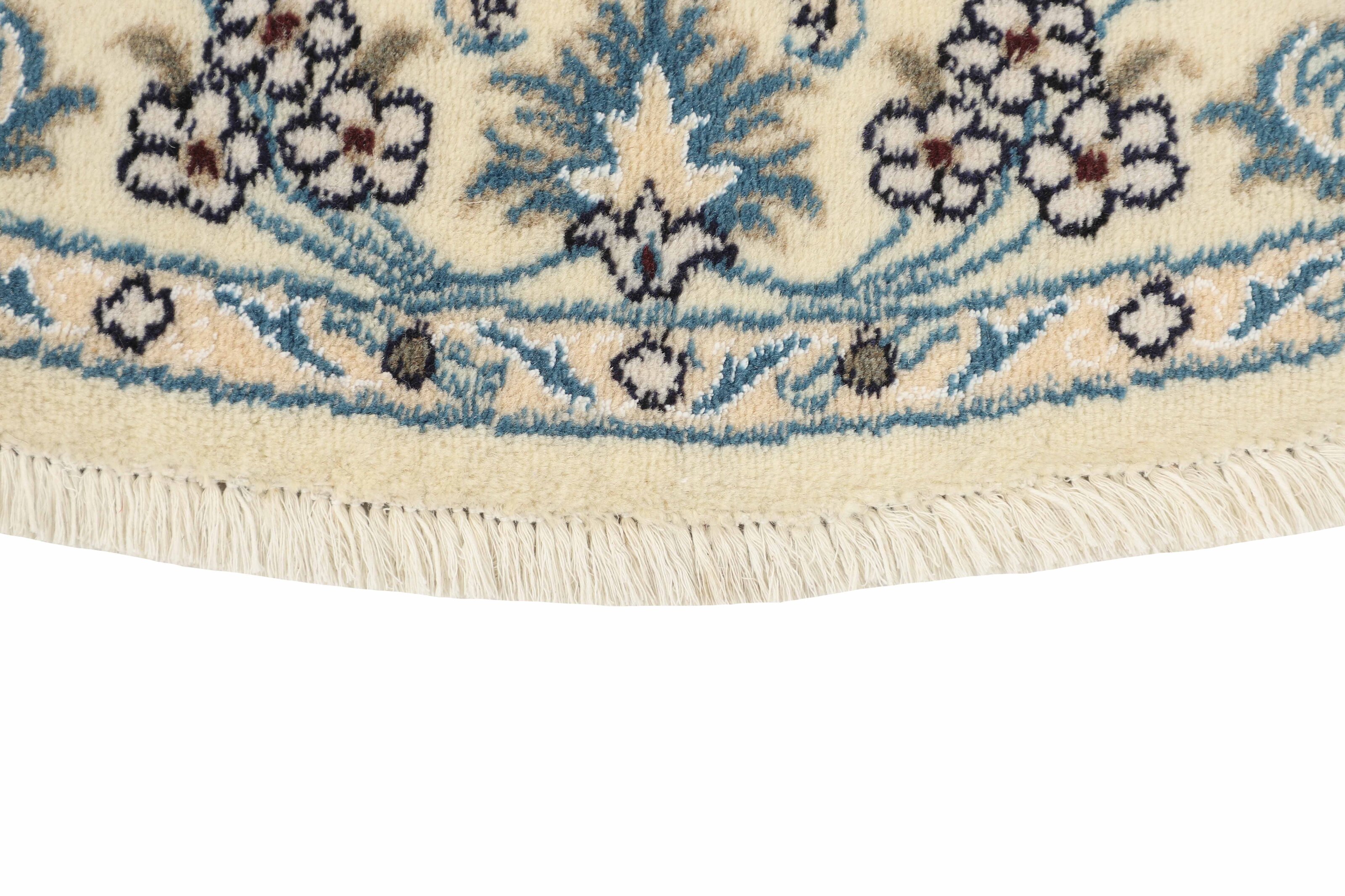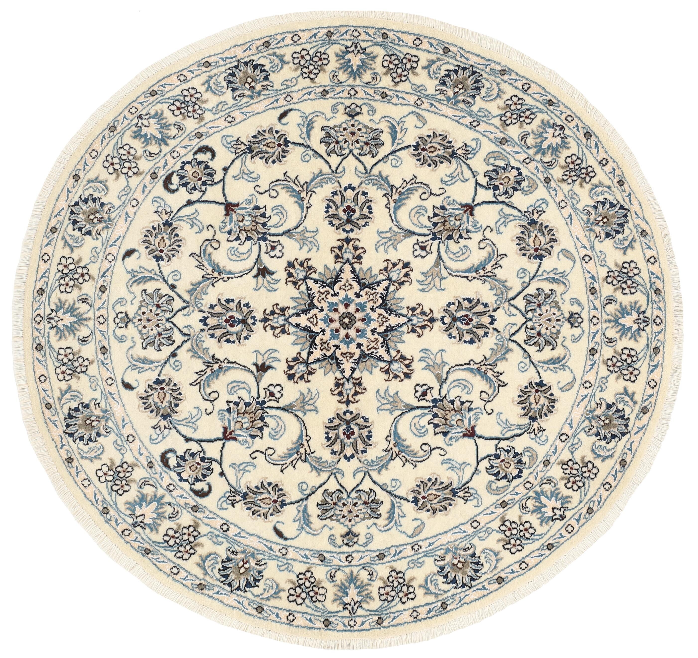 Nain KashmarItem no.: 1519838 Size: 145 cm x 145 cmNain is a city of about 50.000 people, located in the Isfahan Province. It has historic significance, since it was the last stop on caravan routes before Kavir-a-Lut, one of the deserts. The Nain Mosque is one of the oldest, and is built far better than the later and more famous mosques of Isfahan. The industry in Nain was traditionally focused on the production of wool garments, but the weavers switched to rug production when the demand fell. Their new products soon became famous, as the weavers were skilled and used good quality materials. The warp and weft are cotton, with a wool pile and contours of silk. Sometimes, silk is used more in the base. The colours are refined; nuances of ivory and cream, with small areas of red, green, and blue. As with the rugs from Isfahan, the patterns of the Nain rugs are also classical. The Nain rugs are made in all sizes, including the very large of up to 60m2, and some of these have a pure silk pile. The largest Nain rug produced was 20 by 20 metres.