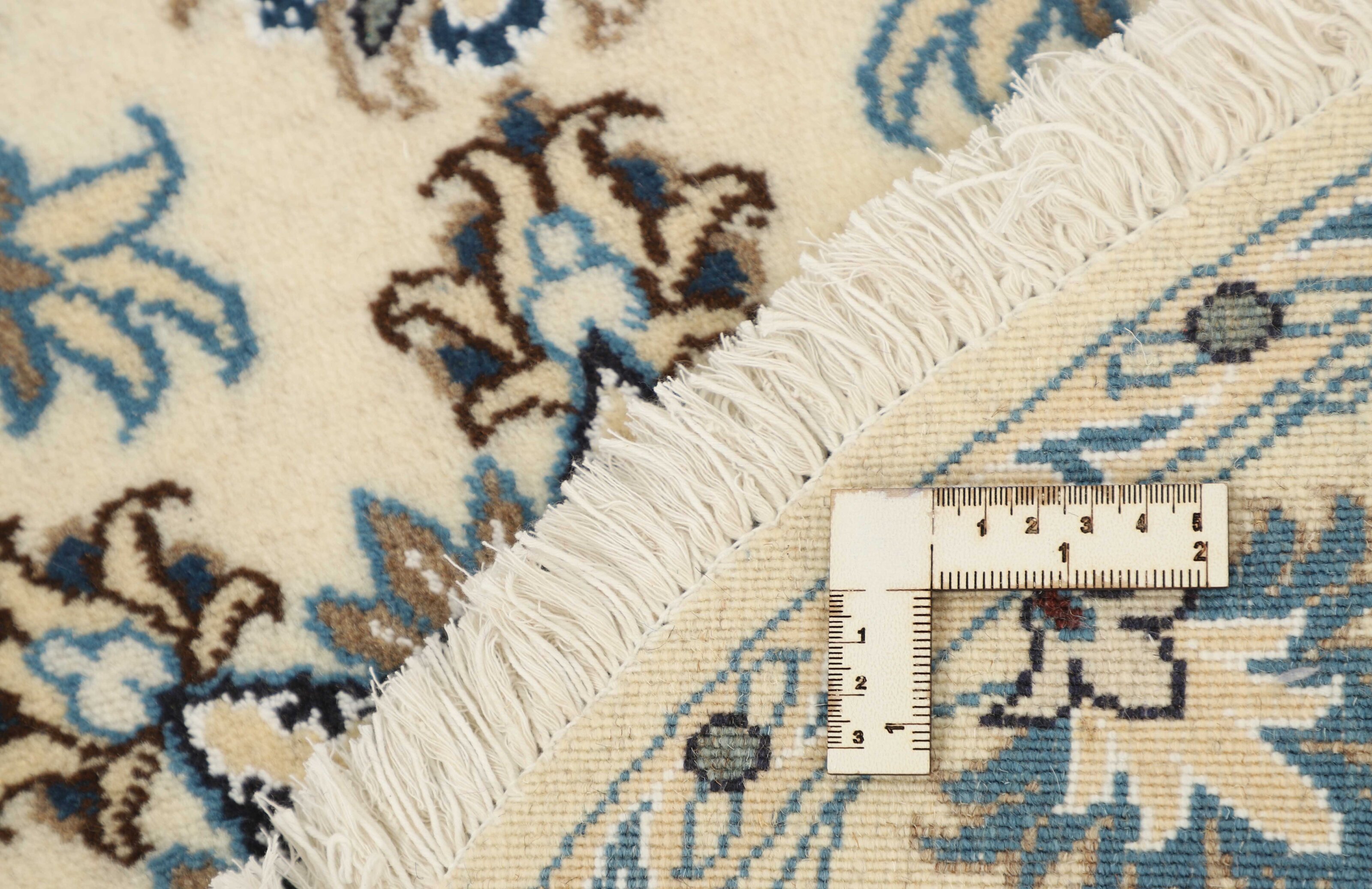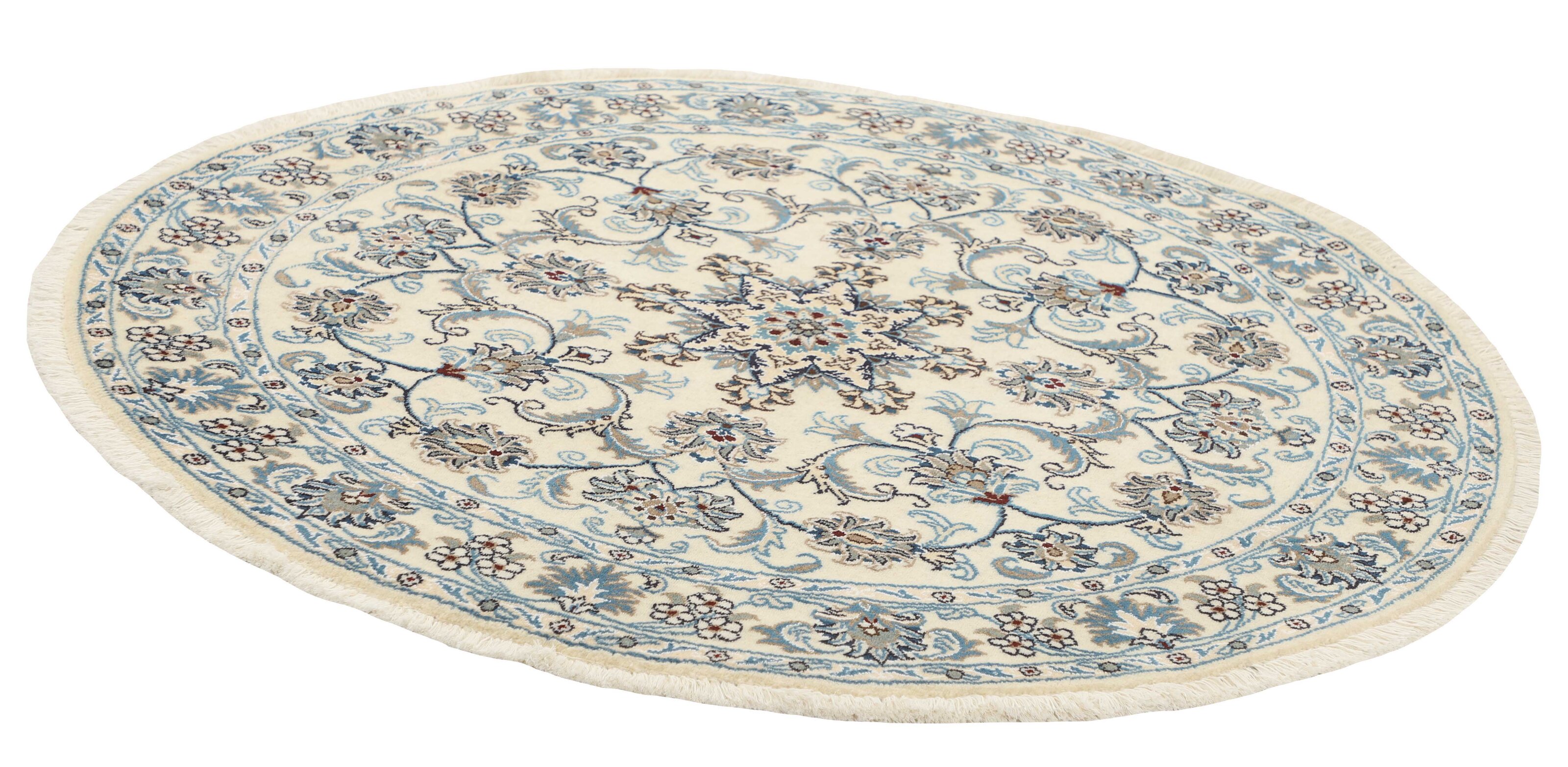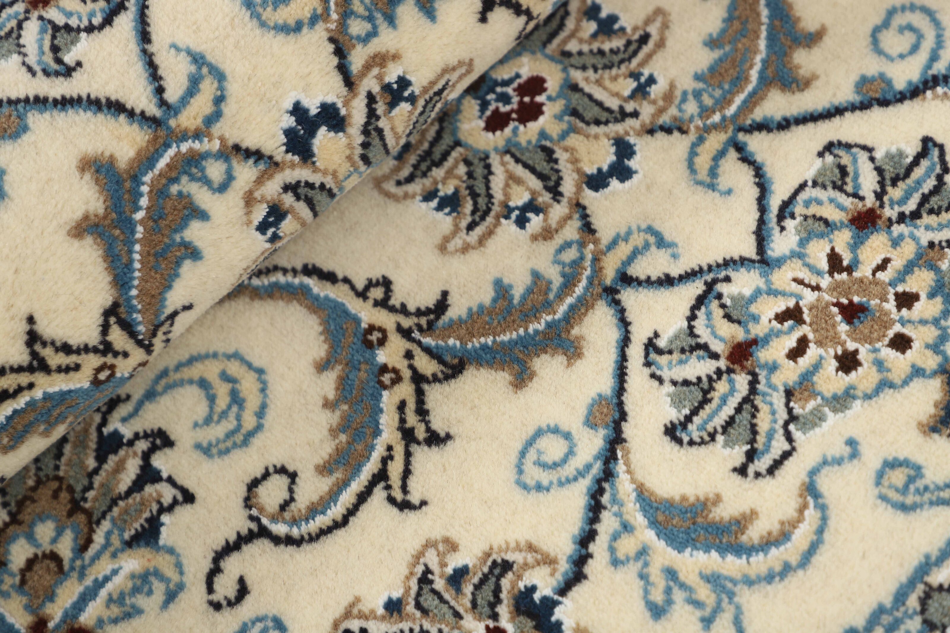 Nain KashmarItem no.: 1519840 Size: 145 cm x 145 cmNain is a city of about 50.000 people, located in the Isfahan Province. It has historic significance, since it was the last stop on caravan routes before Kavir-a-Lut, one of the deserts. The Nain Mosque is one of the oldest, and is built far better than the later and more famous mosques of Isfahan. The industry in Nain was traditionally focused on the production of wool garments, but the weavers switched to rug production when the demand fell. Their new products soon became famous, as the weavers were skilled and used good quality materials. The warp and weft are cotton, with a wool pile and contours of silk. Sometimes, silk is used more in the base. The colours are refined; nuances of ivory and cream, with small areas of red, green, and blue. As with the rugs from Isfahan, the patterns of the Nain rugs are also classical. The Nain rugs are made in all sizes, including the very large of up to 60m2, and some of these have a pure silk pile. The largest Nain rug produced was 20 by 20 metres.