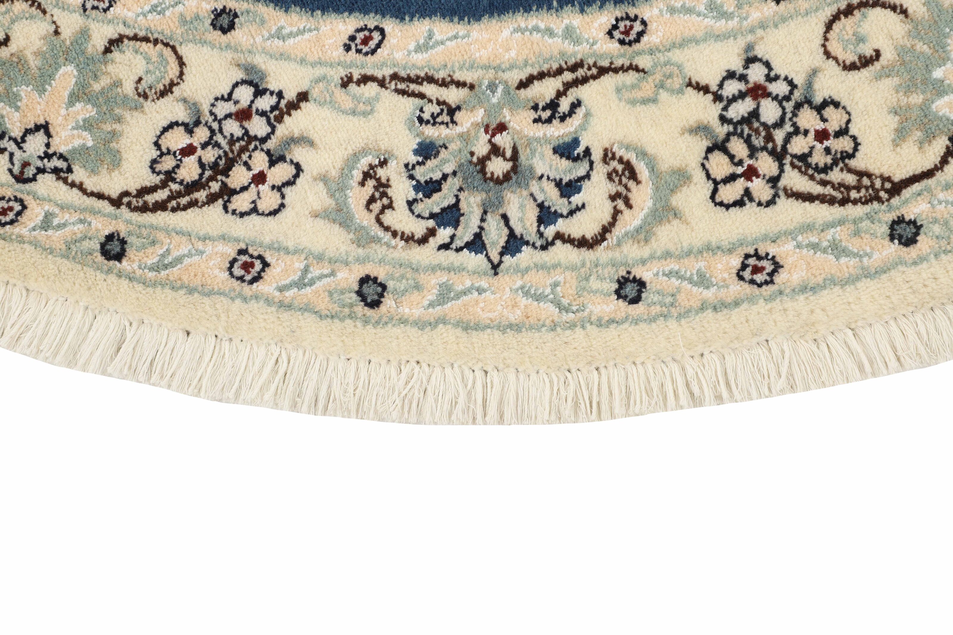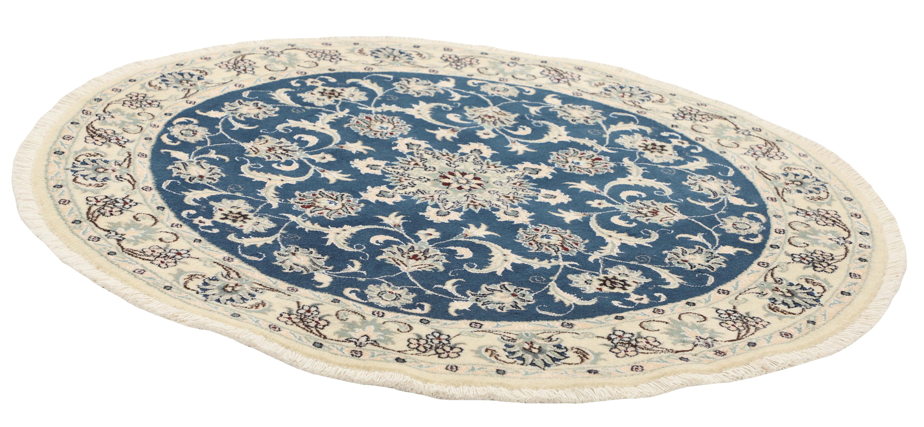 Nain KashmarItem no.: 1519842 Size: 145 cm x 145 cmNain is a city of about 50.000 people, located in the Isfahan Province. It has historic significance, since it was the last stop on caravan routes before Kavir-a-Lut, one of the deserts. The Nain Mosque is one of the oldest, and is built far better than the later and more famous mosques of Isfahan. The industry in Nain was traditionally focused on the production of wool garments, but the weavers switched to rug production when the demand fell. Their new products soon became famous, as the weavers were skilled and used good quality materials. The warp and weft are cotton, with a wool pile and contours of silk. Sometimes, silk is used more in the base. The colours are refined; nuances of ivory and cream, with small areas of red, green, and blue. As with the rugs from Isfahan, the patterns of the Nain rugs are also classical. The Nain rugs are made in all sizes, including the very large of up to 60m2, and some of these have a pure silk pile. The largest Nain rug produced was 20 by 20 metres.