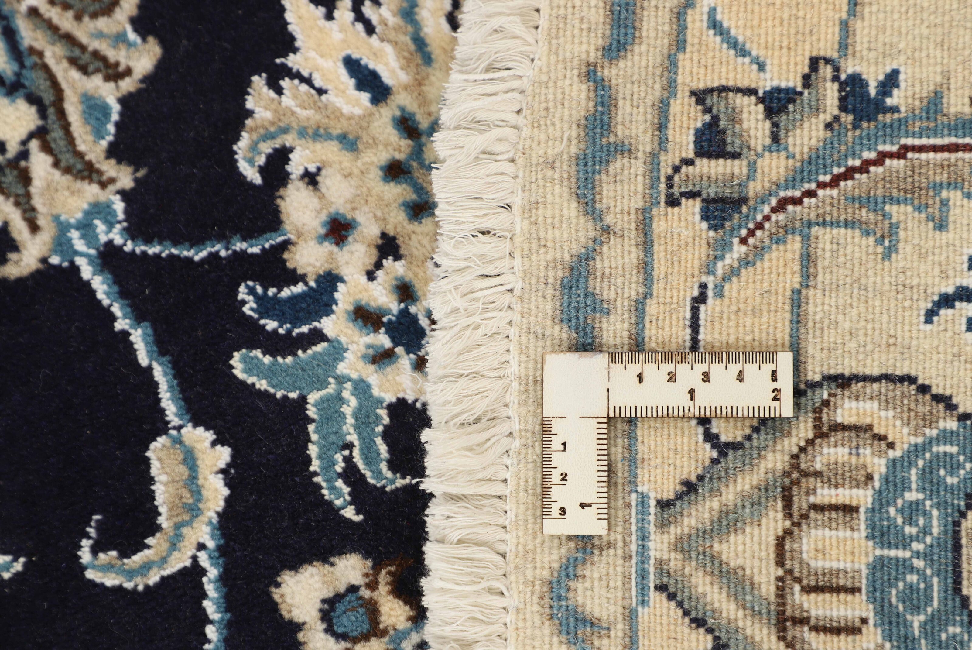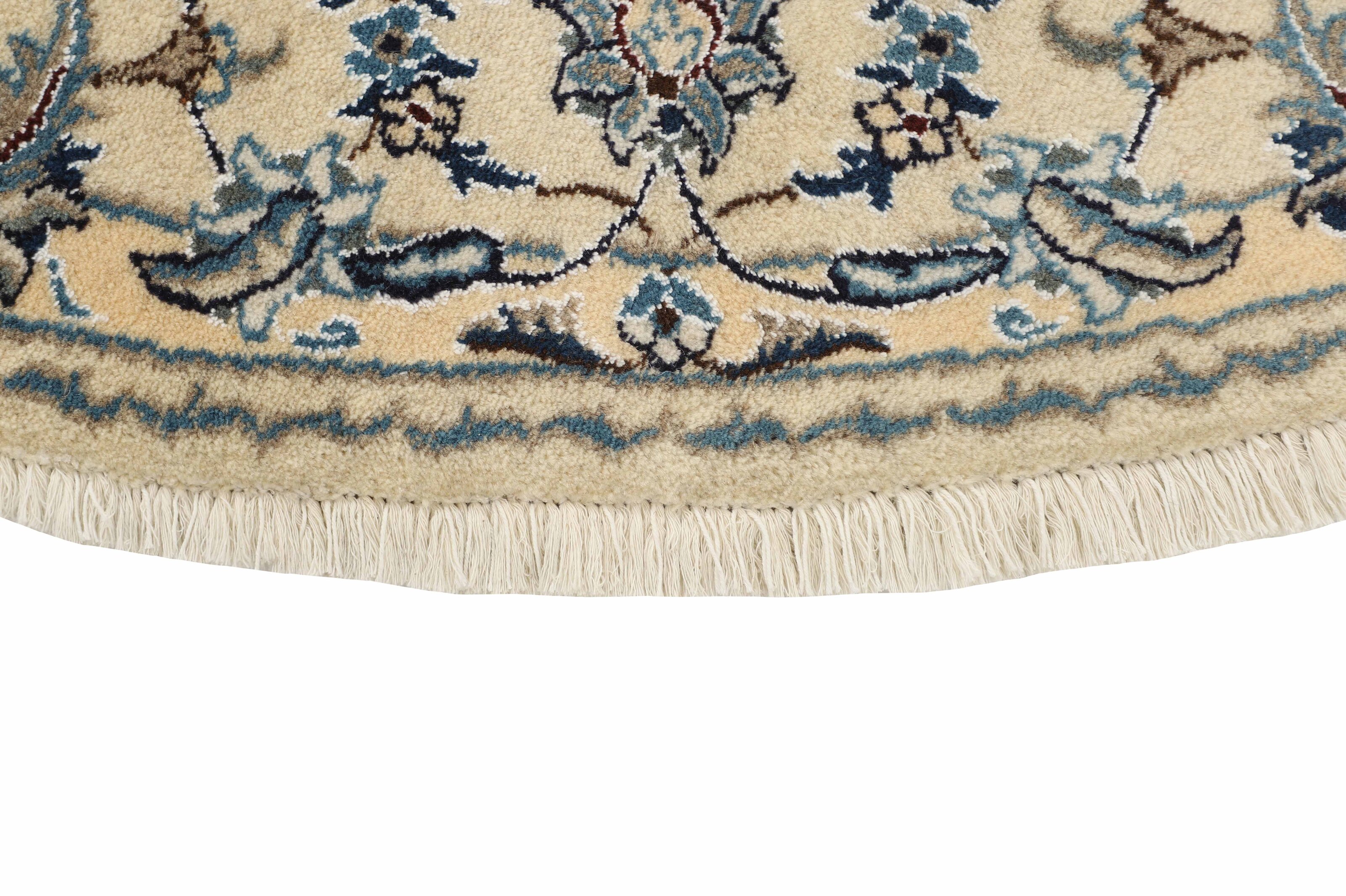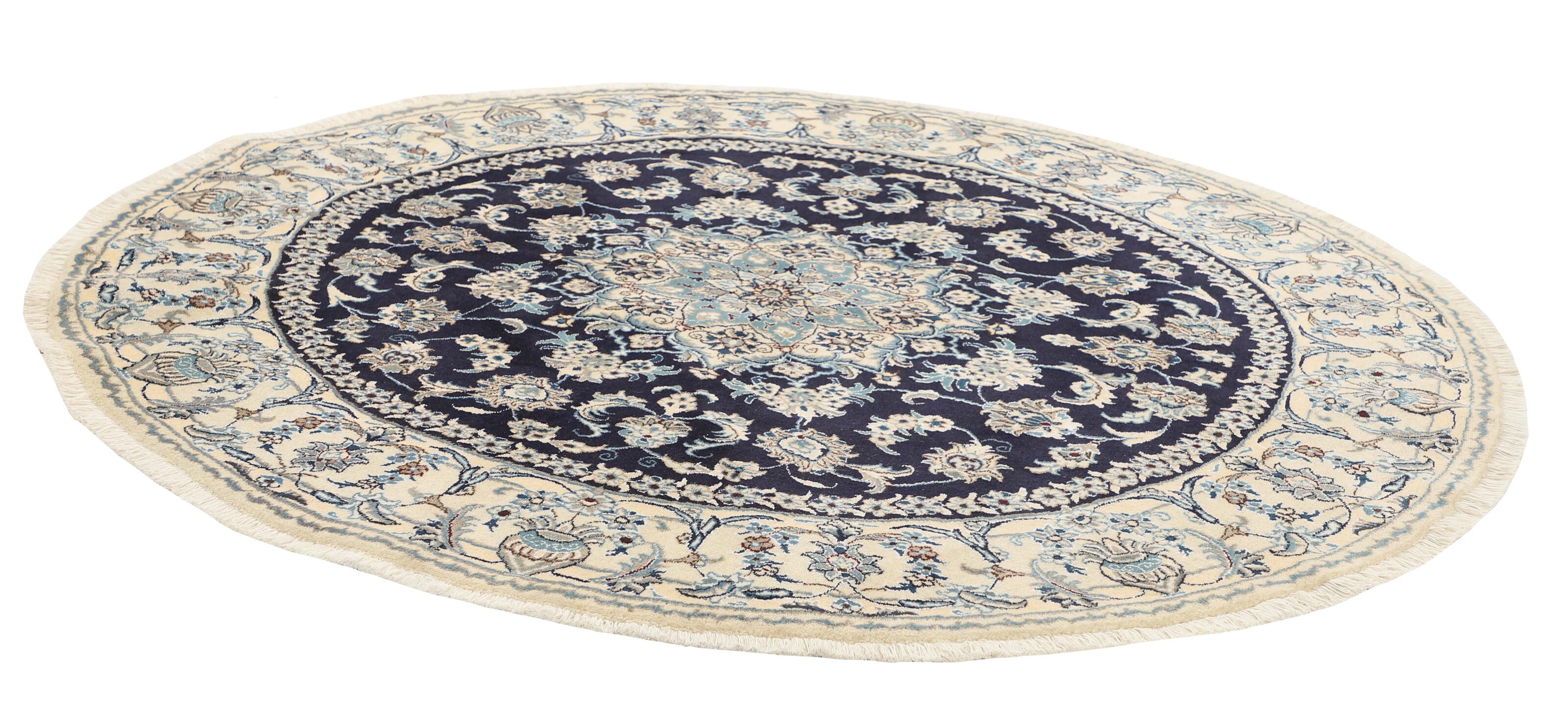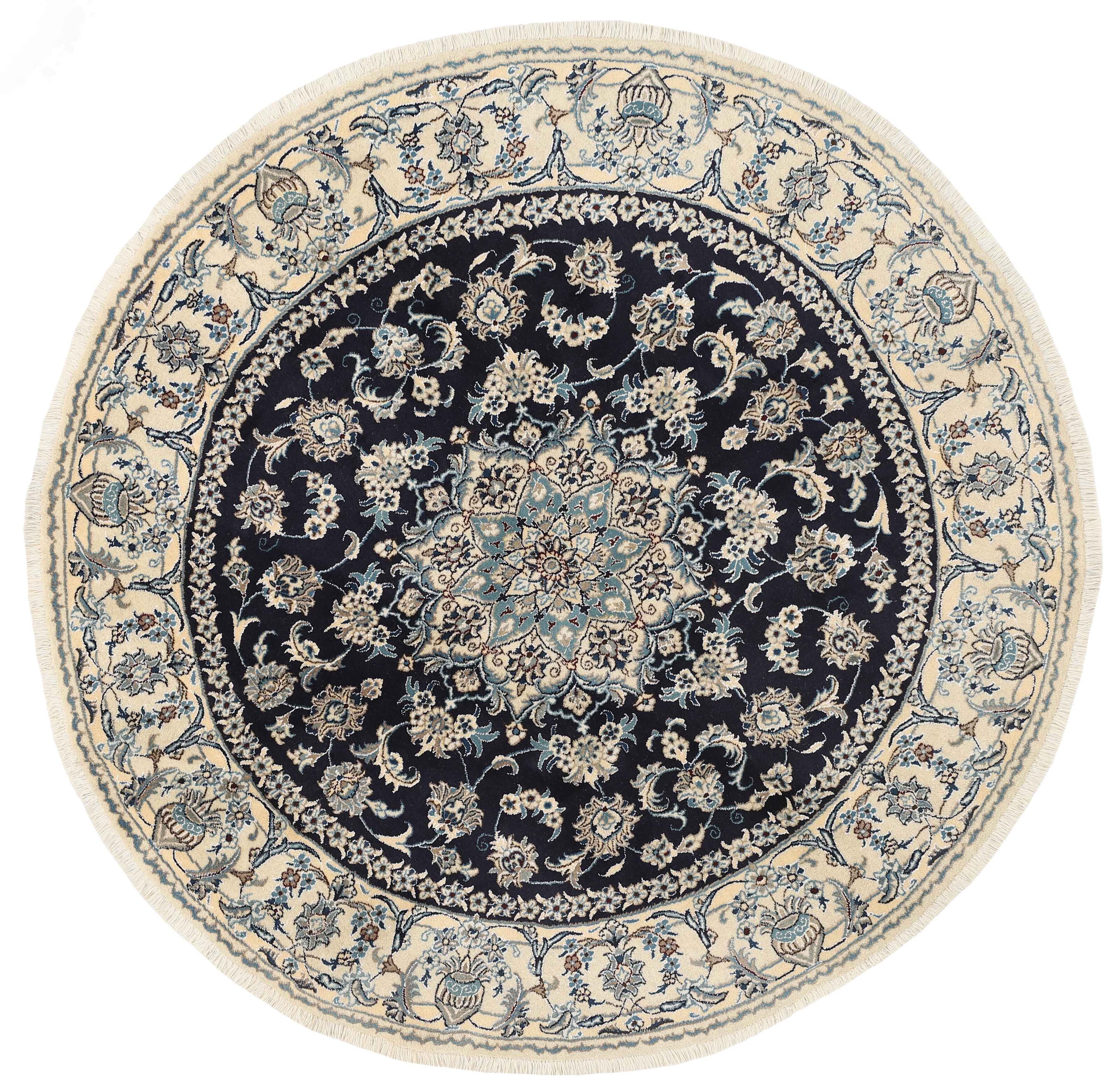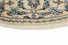 Nain KashmarItem no.: 1519848 Size: 195 cm x 195 cmNain is a city of about 50.000 people, located in the Isfahan Province. It has historic significance, since it was the last stop on caravan routes before Kavir-a-Lut, one of the deserts. The Nain Mosque is one of the oldest, and is built far better than the later and more famous mosques of Isfahan. The industry in Nain was traditionally focused on the production of wool garments, but the weavers switched to rug production when the demand fell. Their new products soon became famous, as the weavers were skilled and used good quality materials. The warp and weft are cotton, with a wool pile and contours of silk. Sometimes, silk is used more in the base. The colours are refined; nuances of ivory and cream, with small areas of red, green, and blue. As with the rugs from Isfahan, the patterns of the Nain rugs are also classical. The Nain rugs are made in all sizes, including the very large of up to 60m2, and some of these have a pure silk pile. The largest Nain rug produced was 20 by 20 metres.