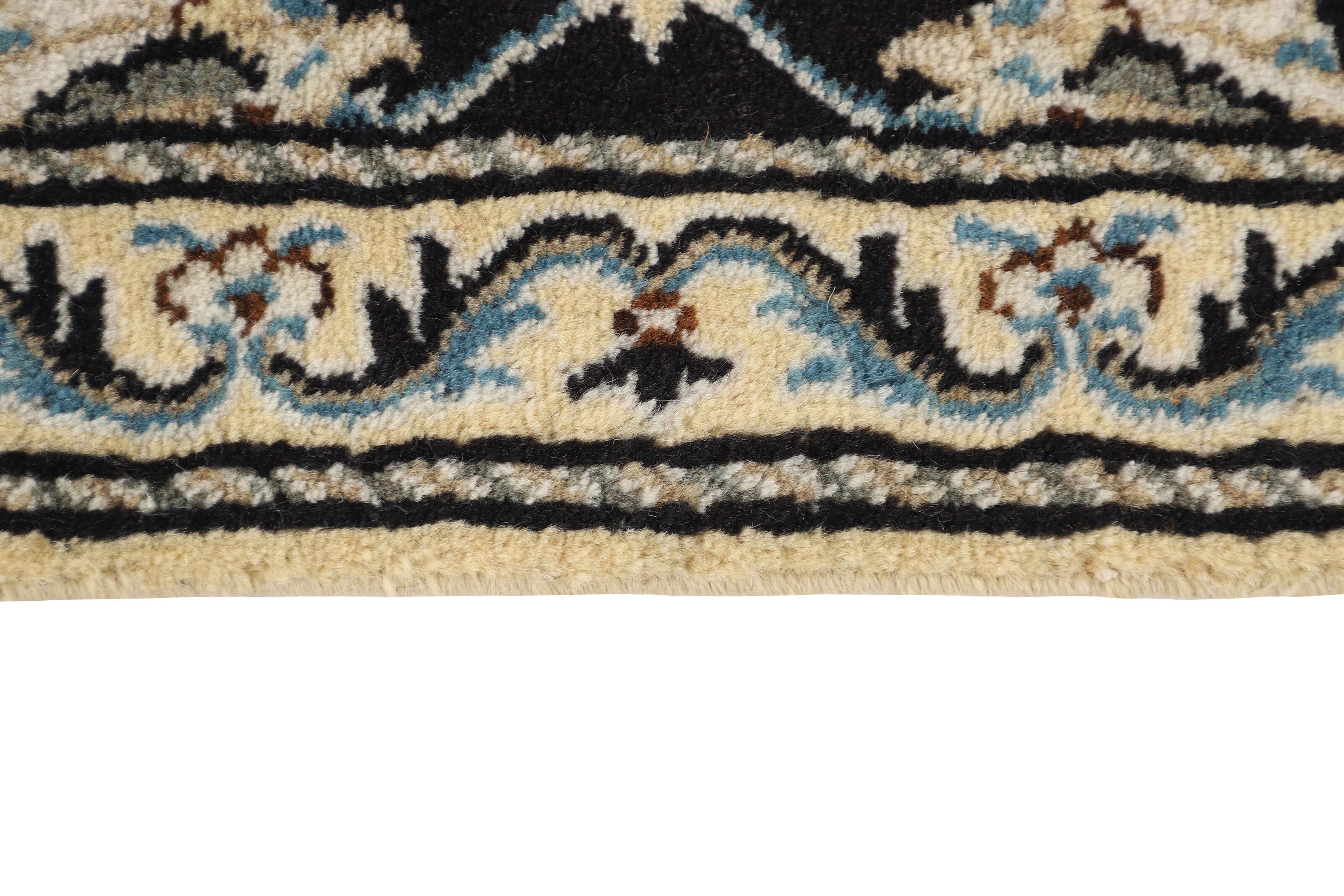 Nain KashmarItem no.: 1519879 Size: 78 cm x 193 cmNain is a city of about 50.000 people, located in the Isfahan Province. It has historic significance, since it was the last stop on caravan routes before Kavir-a-Lut, one of the deserts. The Nain Mosque is one of the oldest, and is built far better than the later and more famous mosques of Isfahan. The industry in Nain was traditionally focused on the production of wool garments, but the weavers switched to rug production when the demand fell. Their new products soon became famous, as the weavers were skilled and used good quality materials. The warp and weft are cotton, with a wool pile and contours of silk. Sometimes, silk is used more in the base. The colours are refined; nuances of ivory and cream, with small areas of red, green, and blue. As with the rugs from Isfahan, the patterns of the Nain rugs are also classical. The Nain rugs are made in all sizes, including the very large of up to 60m2, and some of these have a pure silk pile. The largest Nain rug produced was 20 by 20 metres.
