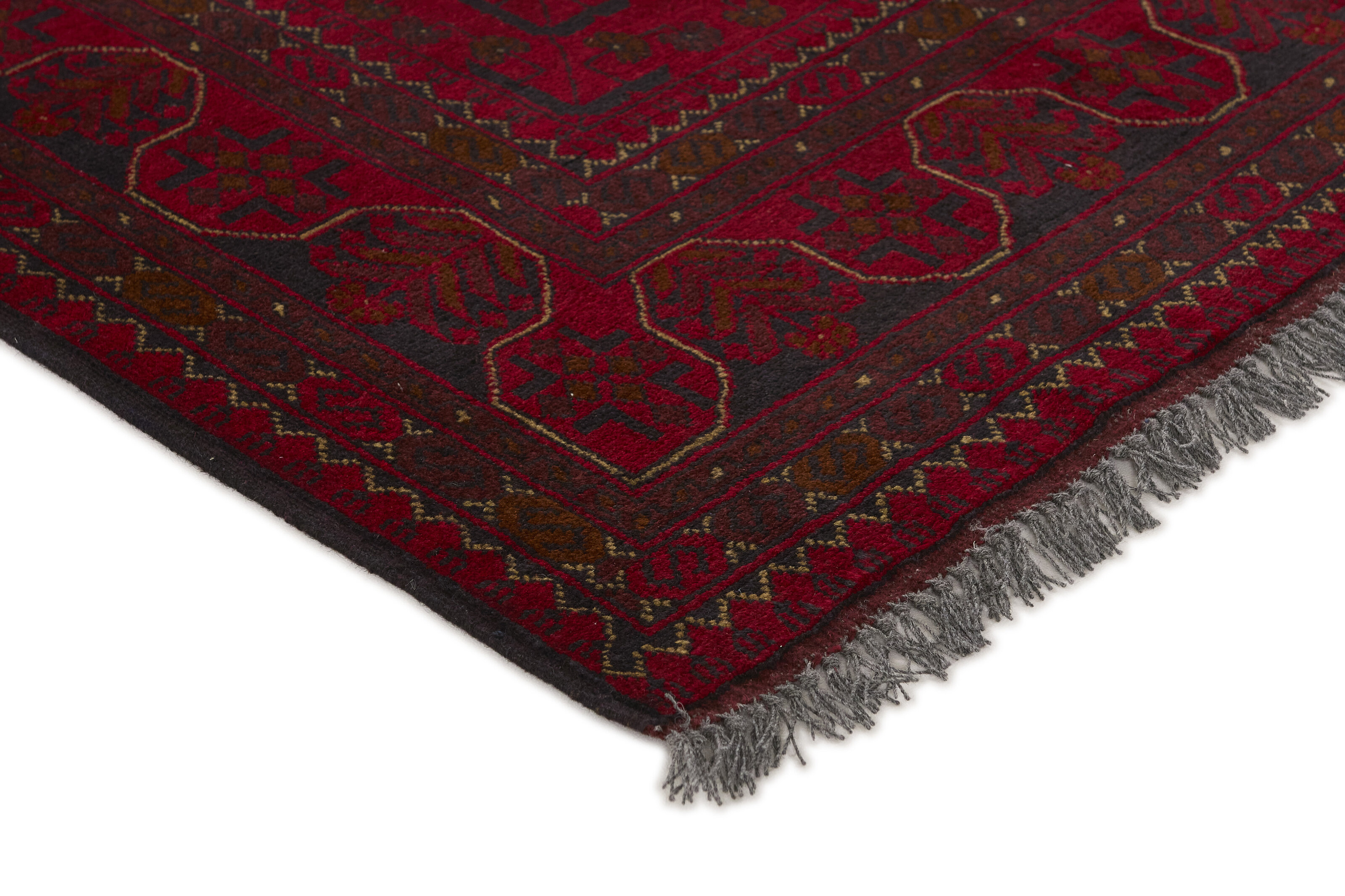 Two of the most popular Afghan rugs are Khal Mohammadi/Old Afghan, and Afghan Aktscha. Khal Mohammadi is handmade by Turkmens in northern Afghanistan. Both Turkmenistan to the North and Afghnaistan to the South are mostly inhabited by nomadic tribes. Kabul, the capitol of Afghanistan, and the city of Herat, are important centres for Afghan rugs. Characteristic of these rugs is the deep, warm, and fiery red base colour, the relatively high and sturdy pile, the wool base weave, the use of goat’s and horse’s hair, and knotting using the Seneh knot and the Gül (Elephant’s Foot) pattern. The base colour is a wide range of warm red nuances, from rust to copper brown. The pattern is a very dark blue, almost black, with ochre and ivory white colour.